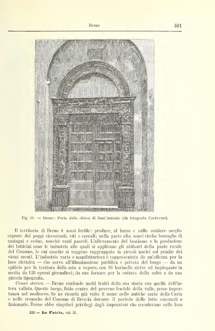 Cenno storico. — Breno confonde molti tratti della sua storia con quella dell'intera vallata. Questo borgo, fatto centro del governo feudale della valle, prese importanza nel medioevo. Se ne ricorda più volte il nome nelle antiche carte della Curia e nelle cronache del Comune di Brescia durante il periodo delle lotte comunali e l'azionarie. Breno ebbe singolari privilegi dagli imperatori che scendevano colle loro