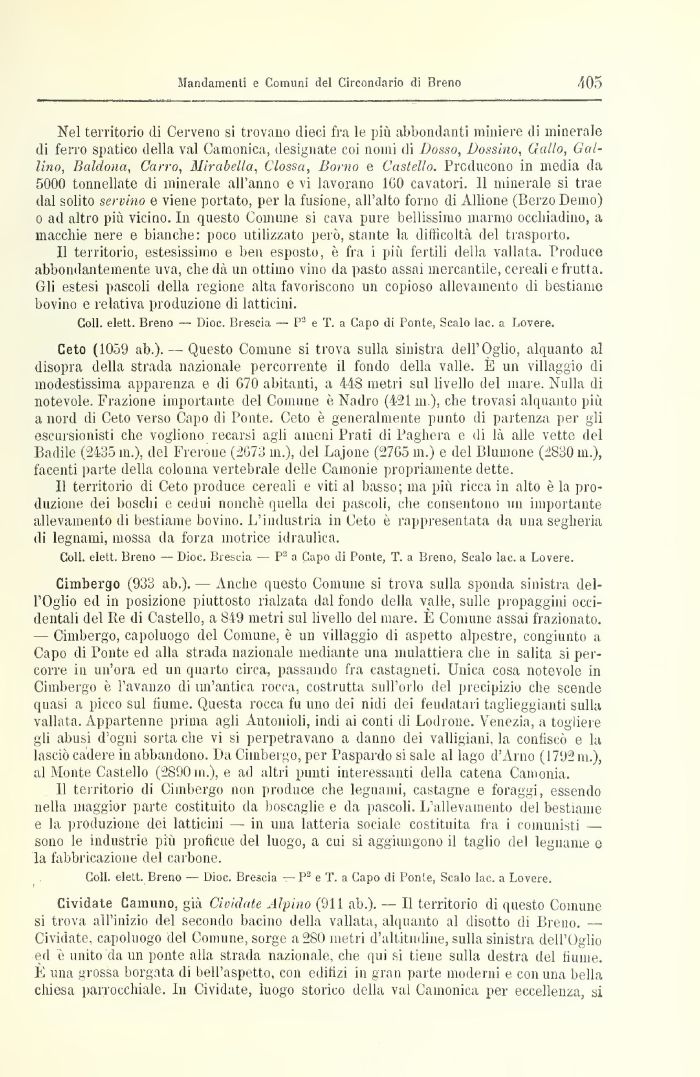 Ceto (1059 ab.). — Questo Comune si trova sulla sinistra dell'Oglio, alquanto al disopra della strada nazionale percorrente il fondo della valle. È un villaggio di modestissima apparenza e di 670 abitanti, a 448 metri sul livello del mare. Nulla di notevole. Frazione importante del Comune è Nadio (421 m.), che trovasi alquanto più a nord di Ceto verso Capo di Ponte. Ceto è generalmente punto di partenza per gli escursionisti che vogliono recarsi agli ameni Prati di Paghera e di là alle vette del Badile (2435 ili.), del Freroue (2673 in.), del Lajone (2765 in.) e del Blumone (2830 in.), facenti parte della colonna vertebrale delle Camonie propriamente dette.
