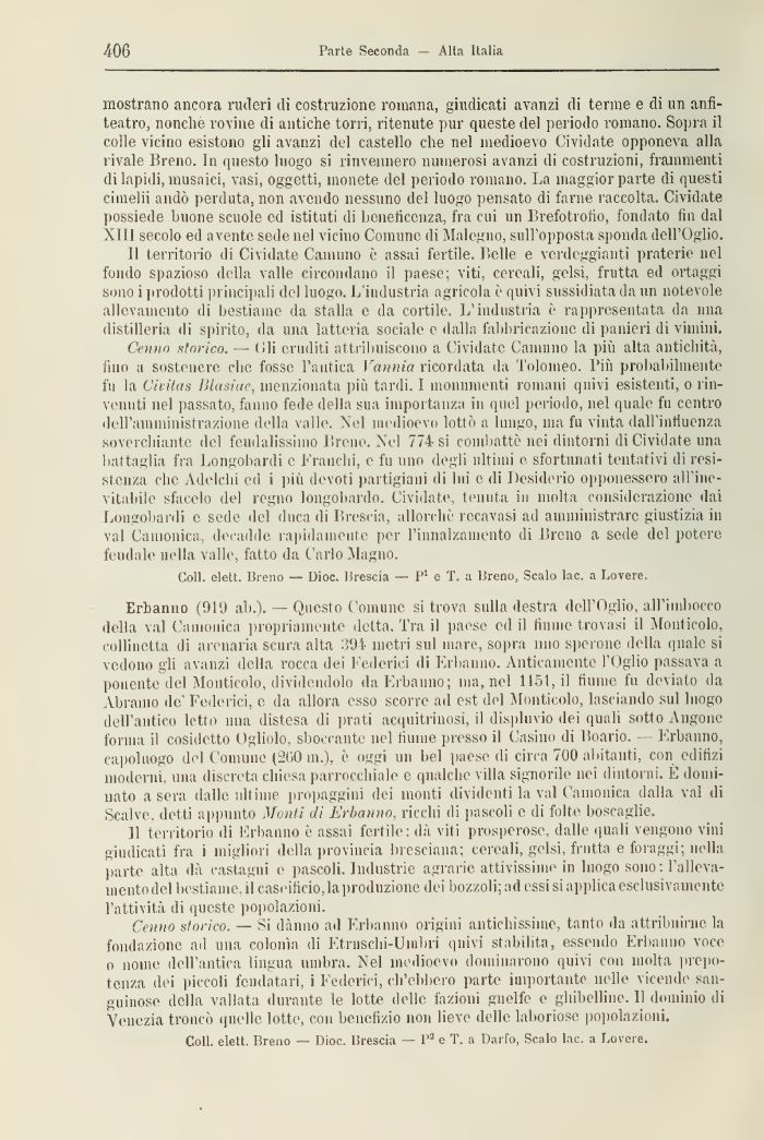 Erbanno (919 ali.). — Questo Comune si trova sulla destra dell'Oglio, all'imbocco della vai Camonica propriamente detta. Tra il paese ed il fiume trovasi il Monticolo, collinetta di arenaria scura alta 391- metri sul mare, sopra uno sperone della quale si vedono gli avanzi della rocca dei Federici di Frbauno. Anticamente l'Oglio passava a ponente del Monticolo, dividendolo da Erbanno; ma, nel 1151, il fiume fu deviato da Àbramo de' Federici, e da allora esso scorre ad est del Monticolo, lasciando sul luogo dell'antico letto mia distesa di prati acquitrinosi, il displuvio dei quali sotto Angone forma il cosidotto Ogliolo, sboccante nel fiume presso il Casino di Boario. — Erbanno, capoluogo del Comuuc (200 in.), è oggi un bel paese di circa 700 abitanti, con edifizi moderni, una discreta chiesa parrocchiale e qualche villa signorile nei dintorni. È dominato a sera dalle ultime propaggini dei monti dividenti la vai Camonica dalla vai di Scalve, detti appunto Monti dì Erbanno, ricchi di pascoli e di folte boscaglie.