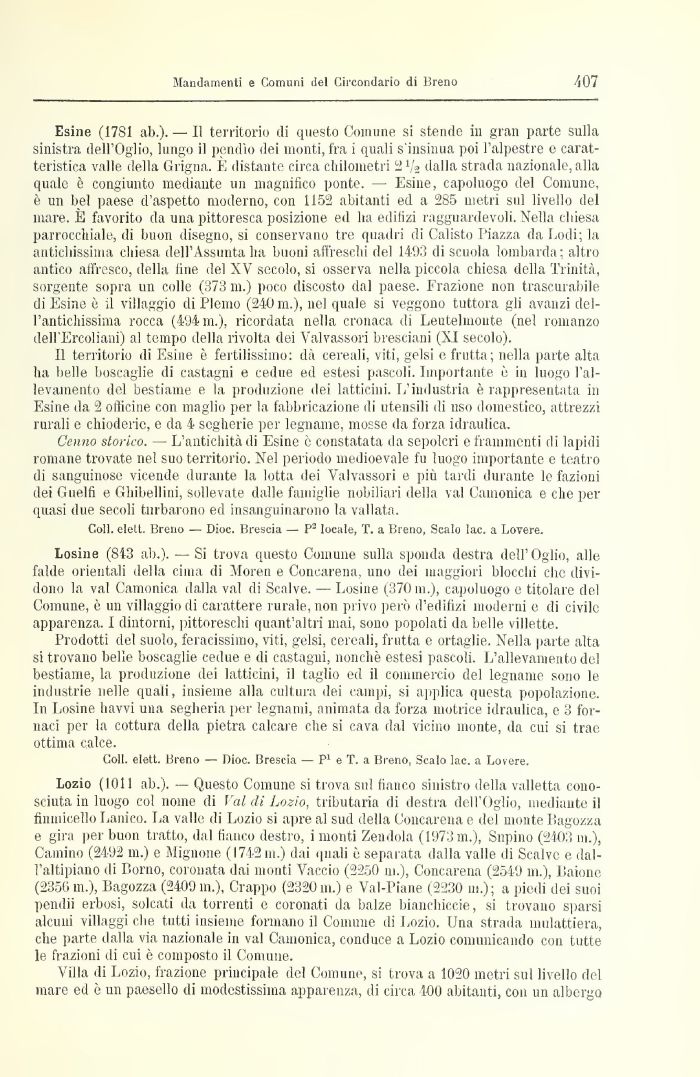 Lozio (1011 ab.). — Questo Comune si trova sul fianco sinistro della valletta conosciuta iu luogo col nome di Val di Lozio, tributaria di destra dell'Oglio, mediante il finniicello Panico. La valle di Lozio si apre al sud della Concarena e del monte Pagozza e gira per buon tratto, dal fianco destro, i monti Zen dola (1973111.), Supino (2403 111.), Camino (2492 111.) e Mignone (1742111.) dai Inali è separata dalla valle di Scalve e dall'altipiano di Borno, coronata dai monti Vaccio (2250 111.), Concarena (2549 111.), Baione (2356in.), Bagozza (2409111.), Grappo (2320111.) e Val-Piane (2230 111.); a piedi dei suoi pendii erbosi, solcati da torrenti e coronati da balze bianchiccie, si trovano sparsi alcuni villaggi che tutti insieme formano il Comune di Lozio. Una strada mulattiera, che parte dalla via nazionale in vai Cainoniea, conduce a Lozio comunicando con tutte le frazioni di cui è composto il Comune.
