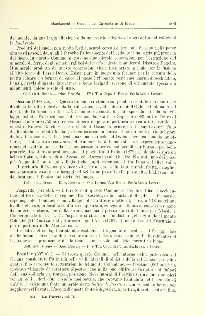 Qssimo (10SS ab.). — Questo Comune si stende sul pendìo orientale dei monti che dividono la vai di Scalve dalla vai Camonica, alla destra dell'Oglio ed alquanto al disotto dell'altipiano (li Porno. È Comune frazionato, formato specialmente da due villaggi distinti: l'uno col nome di Ossimo San Carlo o Superiore (809 m,, e l'altro di Qssimo Inferiore (753 in.): entrambi però di poca importanza e di carattere rurale ed alpestre. Notevole la chiesa parrocchiale di Ossiino Inferiore, eretta sugli avanzi d uno degli antichi caste]lotti feudali, un tempo assai numerosi ed infesti nella parte inferiore della vai Camonica. Dalla strada nazionale si sale ad Ossimo per una comoda mulattiera passante sotto al convento dell'Annunziata, dal quale si ha un sorprendente panorama della vai Camonica; da Ossiino, passando per comodi pendii, perBorno e per belle praterie, il sentiero si prolunga sino al gioghetto di Palina (1272 in.), donde si apre un bello altipiano, si discende ad Azzone ed a Dezzo in vai di Scalve. È questo uno dei passi più frequentati tanto dai valligiani che dagli escursiouisti tra l'una e l'altra valle.