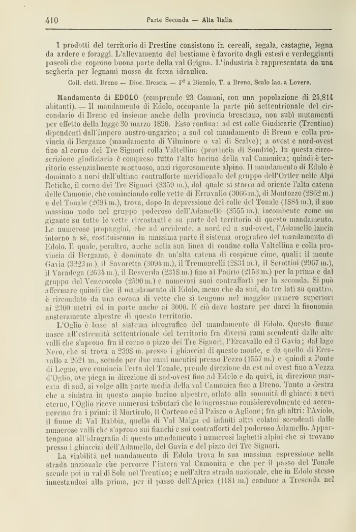 Mandamento di EDOLO (comprende 23 Comuni, con una popolazione di 24,814 abitanti). — 11 mandamento di Edolo, occupante la parte più settentrionale del circondario di Breno ed insieme anche della provincia bresciana, non subì mutamenti per effetto della legge 30 marzo IS'JO. Esso conlina: ad est colle Giudicane (Trentino) dipendenti dall'Impero austro-ungarico; a sud col mandamento di Breno e colla proluda di Bergamo (mandamento di Yilminore o vai di Scalve); a ovest e nord-ovest fino al corno dei Tre Signori colla Valtellina (provincia di Sondrio). In questa circoscrizione giudiziaria è compreso tutto l'alto bacino della vai Camonica; quindi è territorio essenzialmente montuoso, anzi rigorosamente alpino. Il mandamento di Edolo è dominato a nord dall'ultimo contrafforte meridionale del gruppo delI'Ortler nelle Alpi Pietiche, il corno dei Tre Signori (3359 m.), dal quale si stacca ad oriente l'alta catena delle Camonie, che cominciando colle vette di Ercavallo (30UG ni.), di Montozzo (2SG2 ni.) e del Tonale (2091- m.), trova, dopo la depressione del colle del Tonale (lSS4in.), il suo massimo nodo nel gruppo poderoso dell'Adainello (3555 in.), incombente come un gigante su tutte le vette circostanti e su parte del territorio di questo mandamento. Le numerose propaggini, che ad occidente, a nord ed a sud-ovest, l'Adamello lancia intorno a sò, costituiscono in massima parte il sistema orografico del mandamento di Edolo. Il quale, peraltro, anche nella sua linea di conline colla Valtellina e colla provincia di Bergamo, è dominato da un'alta catena di cospicue cime, quali: il monte Ga\ia (3223m.), il Savoretta (309-im,), il Tremoncelli (2834in.), il Serottini (2907 in.), il Varadega (2G3iin.), il Kesverda (23 3 S in.) fino al Pad rio (2153 in.) per la prima e dal gruppo del Yeuerocolo (2590 ni.) c numerosi suoi contrafforti per la seconda. Si può a (Tonnare quindi clic il mandamento di Edolo, meno che da sud, da tre lati su quattro, è circondato da una corona di vette che si tengono nel maggior numero superiori ai 2300 metri ed in parte anche ai 3000. E ciò deve bastare per darci la fisonomia austeramente alpestre di questo territorio.