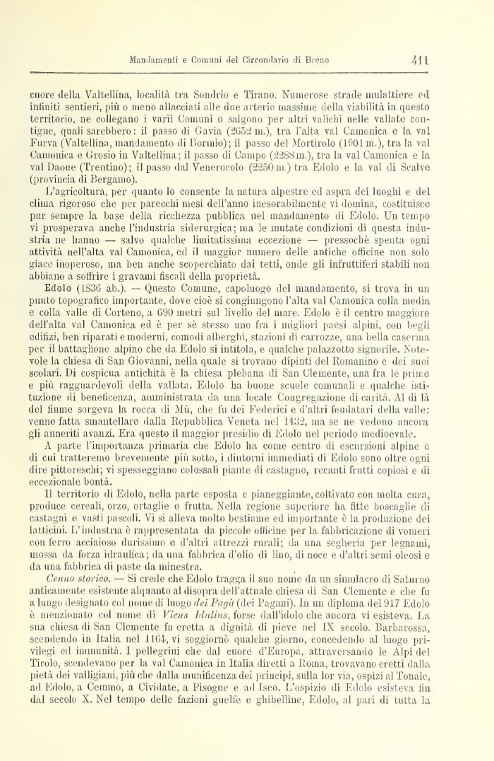 Edolo (1836 ab.). — Questo Comune, capoluogo del mandamento, si trova in un punto topografico importante, dove cioè si congiungono l'alta vai Camonica colla media e colla valle di Corteno, a 690 metri sul livello del mare. Edolo è il centro maggiore dell'alta vai Camonica ed è per sè stesso uno fra i migliori paesi alpini, con begli edifizi, ben riparati e moderni, comodi alberghi, stazioni di carrozze, una bella caserma per il battaglione alpino che da Edolo si intitola, e qualche palazzotto signorile. Notevole la chiesa di San Giovanni, nella quale si trovano dipinti del Roinanino e dei suoi scolari. I)i cospicua antichità è la chiesa plebana (li San Clemente, una fra le prime e più ragguardevoli della vallata. Edolo ha buone scuole comunali e qualche istituzione di beneficenza, amministrata da una locale Congregazione di carità. Al di là del fiume sorgeva la rocca di .Ahi, che fu dei Federici e d'altri feudatari della valle: venne fatta smantellare dalla Repubblica Veneta nel 1432, ma se ne vedono ancora gli anneriti avanzi. Era questo il maggior presidio di Edolo nel periodo ìnedioevale.
