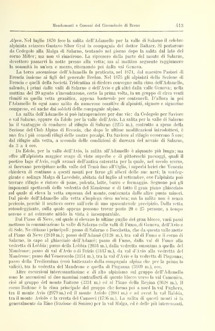 Alpen. Nel luglio 1870 fece la salita dell'Ad aniello per la valle di Salarilo il celebro alpinista svizzero Gustavo Siber Gysi in compagnia del dottor Baltzer. Si portarono da Cedegolo alla Malga di Salarilo, tentando nel giorno dopo la salita dal lato del corno Miller; ma non vi riuscirono. La ripresero dalla parte del monte di Salarilo, dovettero passarvi la notte presso alla vetta; ma al mattino seguente raggiunsero la sommità in un'ora e mezzo, ritornando poi dalla vai Genova.