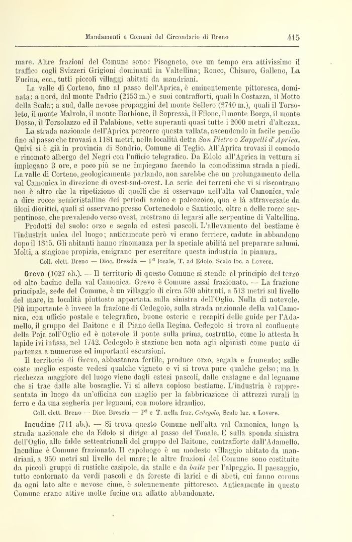 La strada nazionale dell'Aprica percorre questa vallata, ascendendo in facile pendio fino al passo che trovasi a 1181 metri, nella località detta San Pietro o Zappetti d'Aprica. Quivi si è già in provincia di Sondrio, Comune di Teglio. All'Aprica trovasi il comodo e rinomato albergo del Negri con l'ufficio telegrafico. Da Edolo all'Aprica in vettura si impiegano 3 ore, e poco più se ne impiegano facendo la comodissima strada a piedi. La valle di Corteno, geologicamente parlando, non sarebbe che un prolungamento della vai Camonica in direzione di ovest-sud-ovest. La serie dei terreni che vi si riscontrano non è altro che la ripetizione di quelli che si osservano nell'alta vai Camonica, vale a dire rocce seuiicristalline dei periodi azoico e paleozoico, qua e là attraversate da filoni dioritici, quali si osservano presso Cortenedolo e Saiiticolo, oltre a delle rocce ser-pentinose, che prevalendo verso ovest, mostrano di legarsi alle serpentine di Valtellina.