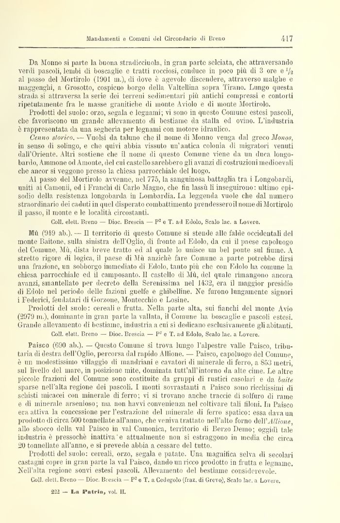 Coli, elett. Breno — Dioc. Brescia — P3 e T. a C.edegolo (fraz. dì Grevo), Scalo lac. a Lovere.