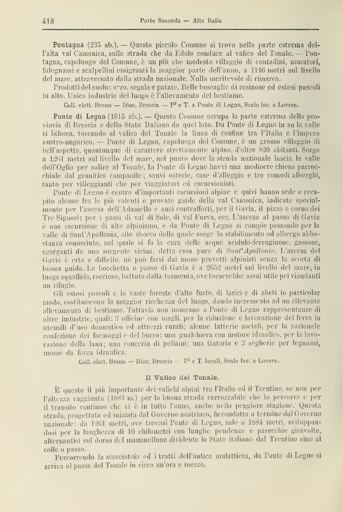 Ponte di Legno (1815 ab.). — Questo Comune occupa la parte estrema della provincia di Brescia e dello Stato Italiano da quel lato. l)a Ponte di Legno in su la valle si biforca, toccando al valico del Tonale la linea di confine tra l'Italia e l'Impero austro-ungarico. — Ponte di Legno, capoluogo del Comune, è 1111 grosso villaggio di bell'aspetto, quantunque di carattere strettamente alpino, d'oltre 820 abitanti. Sorge a 1201 metri sul livello del mare, nel punto dove la strada nazionale lascia la valle dell'Oglio per salire al Tonale, In Ponte di Legno liavvi una mediocre chiesa parrocchiale dal granitico campanile; sonvi osterie, case d'alloggio e tre comodi alberghi, tanto per villeggianti che per viaggiatori ed escursionisti.