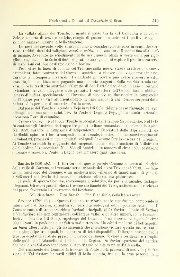 Saviore (1791 ab.). — Questo Connine, territorialmente estesissimo, comprende la intera valle di Saviore, aprentesi sul versante sud-ovest dell'imponente A da me Ilo. Il Comune consta di tre parrocchie o frazioni principali, cioè: Saviore, Ponte di Saviore e Val Saviore (da non confondersi coll'intera valle) e di altre minori, come Fresine e Isola. — Saviore (1210 ni.), capoluogo del Comune, è un discreto villaggio di circa 900 abitanti, in posizione quant'altra mai pittoresca. Ila edifizi moderni di bell'aspetto, un buon alberghetto per gli escursionisti che intendono visitare questa interessantissima plaga alpestre, i quali, in mancanza di letti disponibili all'albergo, possono anche trovare ospitalità cordiale presso il parroco del luogo. Saviore è residenza e recapito delle guide per rAd.-lineilo ed il l'iano della Regina. Da Saviore partono dei sentieri che per la vai Salarilo conducono al lago d'Arno ed alla vetta dell'Adamello.