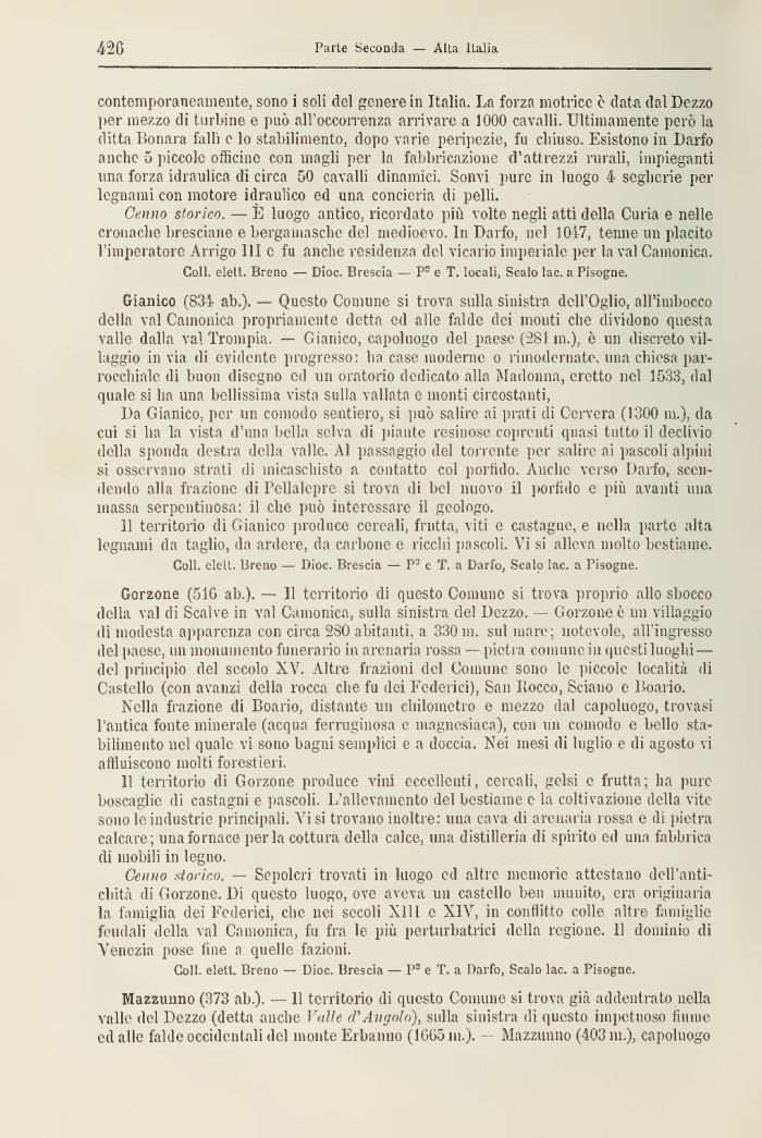 Gorzone (51G ab.). — 11 territorio di questo Comune si trova proprio allo sbocco della vai di Scalve in vai Camonica, sulla sinistra del Dezzo. — Gorzone è 1111 villaggio di modesta apparenza con circa 280 abitanti, a 330 111. sul mare; notevole, all'ingresso del paese, 1111 monumento funerario in arenaria rossa — pietra comune in questi luoghi— del principio del secolo XV. Altre frazioni del Comune sono le piccole località di Castello (con avanzi della rocca che fu dei Federici), San Hocco, Sciano e Boario.