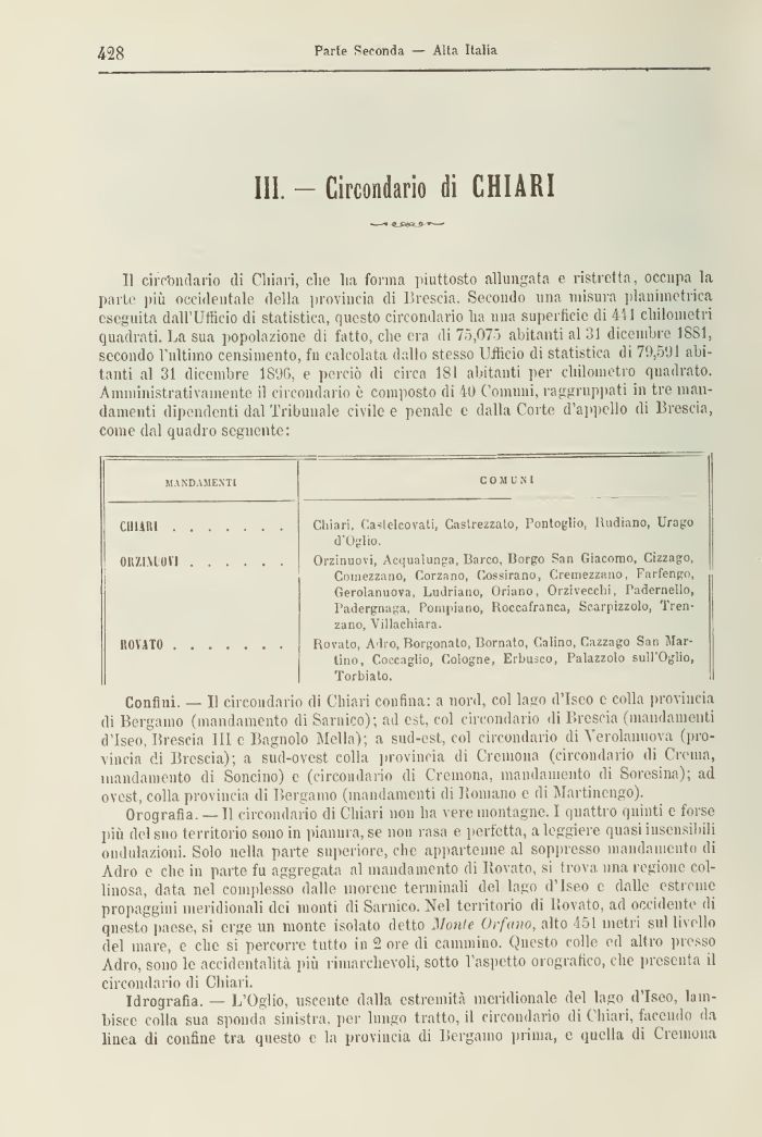 Il circondario di Ciliari, che lia forma piuttosto allungata e ristretta, occupa la parte più occidentale della provincia di lirescia. Secondo una misura planimetrica eseguita dall'Ufficio di statistica, questo circondario lui una superficie di 411 chilometri quadrati. La sua popolazione di fatto, che era di 75,075 abitanti al 31 dicembre ISSI, secondo l'ultimo censimento, fn calcolata dallo stesso Ufficio di statistica di 79,591 abitanti al 31 dicembre 1S9G, e perciò di circa 181 abitanti per chilometro quadrato. Amministrativamente il circondario è composto di 40 Comuni, raggruppati in tre mandamenti dipendenti dal Tribunale civile e penale e dalla Corte d'appello di Brescia, come dal quadro seguente: