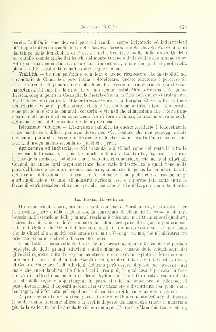 Viabilità. — Se 11011 perfetta e completa, è duopo riconoscere che la viabilità nel circondario di Chiari ben poco lascia a desiderare. Questo teiritorio è percorso da arterie stradali di prilli'ordine e da linee ferroviarie e traniviarie di grandissima importanza. Citiamo fra le prime le grandi strade postali Milano-Brescia e Bergamo-Brescia, congiuiigeiitisi a Coccaglio; la Brescia-Crema, la Cliiari-Orzinuovi-Verolanuova. Frale linee ferroviarie: la Milano-Brescia-Venezia; la Bergamo-Brescia. 1 ra le linee t min viarie a vapore, quella interprovinciale Brescia-Soncino-Crema-Lodi, Numerosissime poi sono le strade comunali, consortili e vicinali che si innestano alle arterie principali e mettono in facili comunicazioni fra di loro i Comuni, le frazioni ei capoluoghi dei mandamenti, del circondario e della provincia.