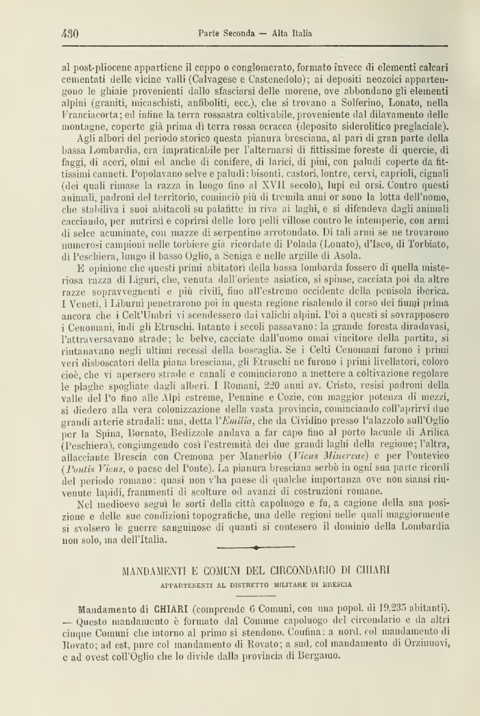 Mandamento di CHIARI (comprende G Comuni, con una popol. di 10,235 abitanti). — Questo mandamento è formato dal Comune capoluogo del circondario e da altri cinque Comuni che intorno al primo si stendono. Confina: a nord, col mandamento di 1 tovato; ad est, pure col mandamento di Rovato; a sud, col mandamento di Orzinuovi, e ad ovest coll'Oglio che lo divide dalla provincia di Bergamo.