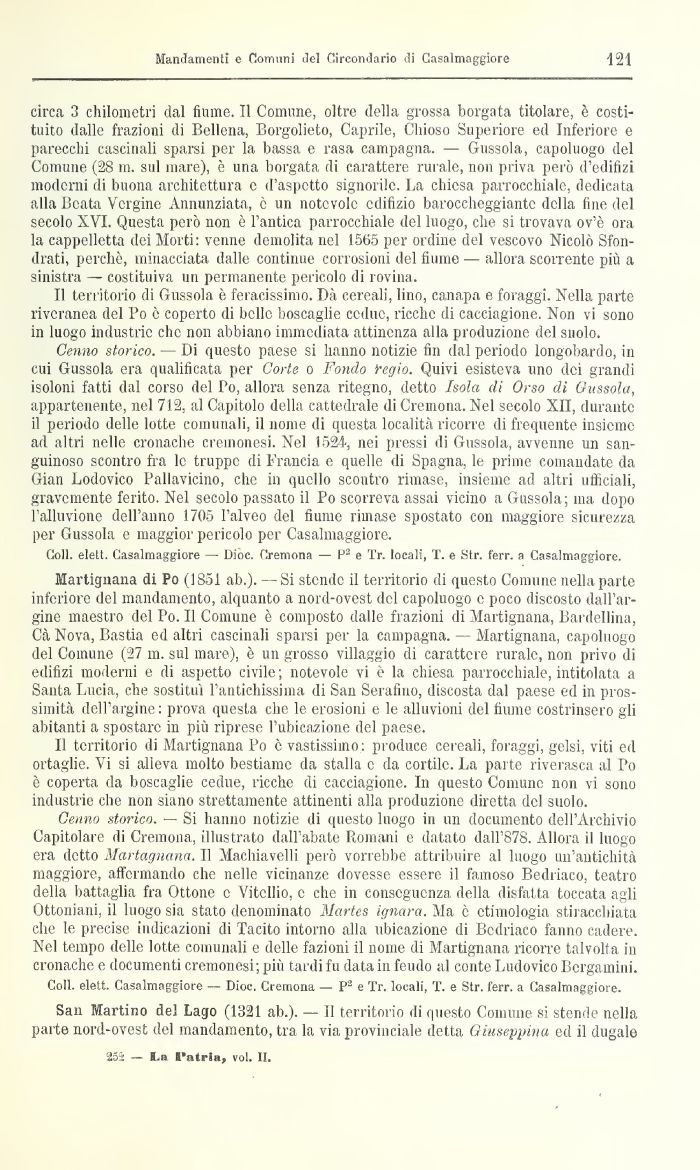 San Martino del Lago (1321 ab.). — Il territorio di questo Connine si stende nella parte nord-ovest del mandamento, tra la via provinciale detta Giuseppina ed il fingale