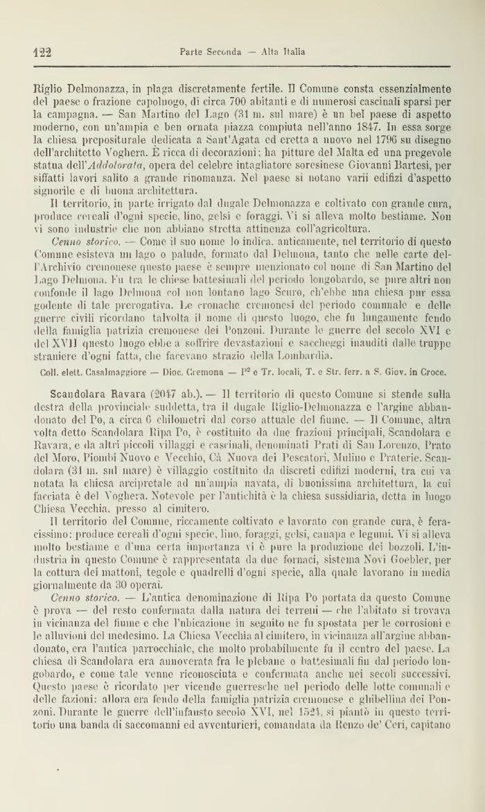 Cenno storico. — L'antica denominazione di Ripa Po portata da questo Comune è prova — del resto confermata dalla natura dei terreni — che l'abitato si trovava in vicinanza del fiume e che l'ubicazione in seguito ne fu spostata per le corrosioni e le alluvioni del medesimo. La Chiesa Vecchia al cimitero, in vicinanza all'argine abbandonato, era l'antica parrocchiale, che molto probabilmente fu il centro del paese. La chiesa di Scandolara era annoverata fra le plebaue o battesimali fin dal periodo longobardo, e conte tale venne riconosciuta e confermata anche nei secoli successivi. Questo paese è ricordato per vicende guerresche nel periodo delle lotte comunali e delle fazioni allora era fendo della famiglia patrizia cremonese e ghibellina dei Pon-zoni. Durante le guerre dell'infausto secalo XVI, nel 1524 si piantò in questo territorio una banda di saccomanni ed avventurieri, comandata ila Kenzo de' Ceri, capitano