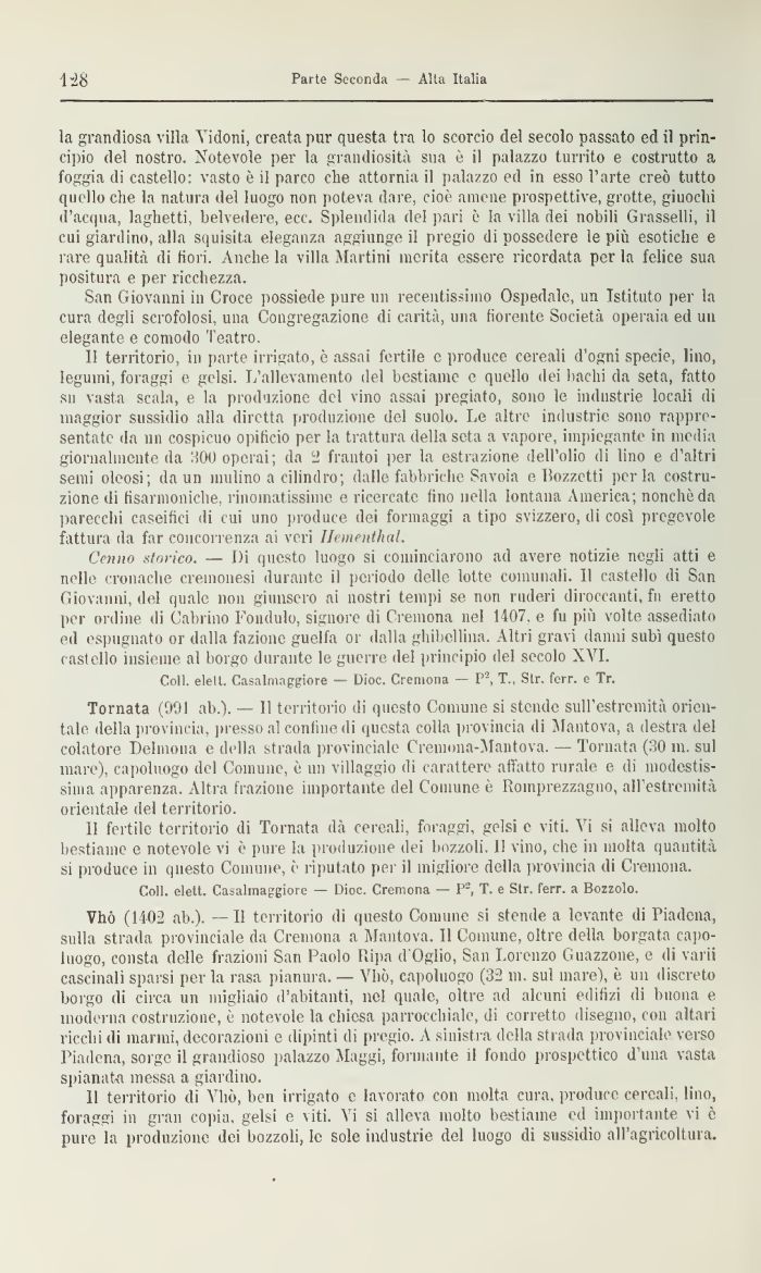 Vhò (1402 ab.). — II territorio di questo Comune si stende a levante di Piadena, sulla strada provinciale da Cremona a Mantova. Il Comune, oltre della borgata capoluogo, consta delle frazioni San Paolo Pupa d'Oglio, San Lorenzo Guazzone, e di varii cascinali sparsi per la rasa pianura. — Vhò, capoluogo (32 ni. sul mare), è un discreto borgo di circa un migliaio d'abitanti, nel quale, oltre ad alcuni edifizi di buona e moderna costruzione, è notevole la chiesa parrocchiale, di corretto disegno, con altari ricchi di marini, decorazioni e dipinti di pregio. A sinistra della strada provinciale verso Piadena, sorge il grandioso palazzo Maggi, formante il fondo prospettico d'una vasta spianata messa a giardino.