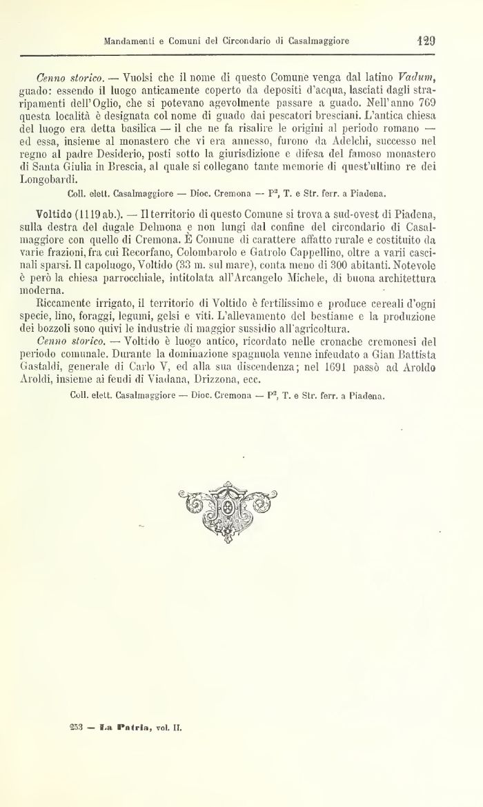 Cenno storico. — Voltido è luogo antico, ricordato nelle cronache cremonesi del periodo comunale. Durante la dominazione spagnuola venne infeudato a Gian Battista Gastaldi, generale di Carlo V, ed alla sua discendenza, nel 1691 passò ad Arolclo Aloidi, insieme ai feudi di Viadana, Drizzona, ecc.