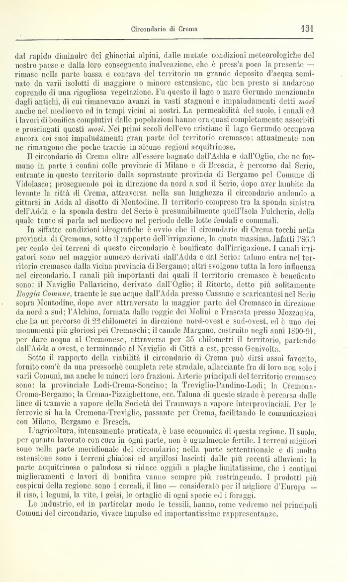 dal rapido diminuire dei ghiacciai alpini, dalle mutate condizioni meteorologiche del nostro paese e dalla loro conseguente inalveazione, che è pressa poco la presente — rimase nella parte bassa e concava del territorio un granile deposito d'acqua seminato da yarii isolotti di maggiore o minore estensione, che ben presto si andarono coprendo di una rigogliosa vegetazione. Fu questo il lago o mare Geraldo menzionato dagli antichi, di cui rimanevano avanzi in vasti stagnoni e impaludamenti detti mosi anche nel medioevo ed in tempi vicini ai nostri. La permeabilità del suolo, i canali ed 1 lavori di bonifica compiutivi dalle popolazioni hanno ora quasi completamente assorbiti e prosciugati questi mosi. Nei primi secoli dell'evo cristiano il lago Gerundo occupava ancora coi suoi impaludamenti gran parte del territorio cremasco: attualmente non ne rimangono che poche traccie 111 alcune regioni acquitrinose.