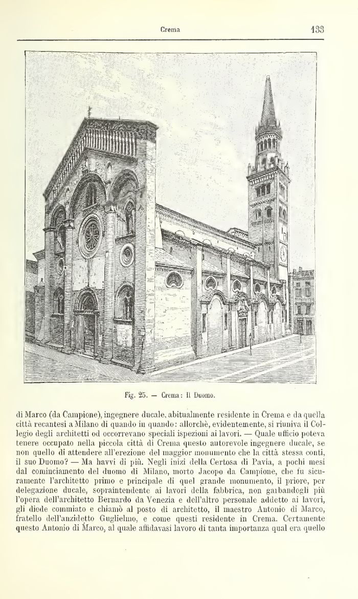di Marco (da Campione), ingegnere ducale, abitualmente residente in Crema e da quella città recantesi a Milano di quando in quando: allorché, evidentemente, sì riuniva il Collegio degli architetti od occorrevano speciali ispezioni ai lavori. — Quale ufficio poteva tenere occupato nella piccola città di Crema questo autorevole ingegnere ducale, se non quello di attendere all'erezione del maggior monumento che la città stessa conti, il suo Duomo? — Ma havvi di più. Negli inizi della Certosa di Pavia, a pochi mesi dal coniineiaincnto del duomo di Milano, morto Jacopo da Campione, che fu sicuramente l'architetto primo e principale di quel grande monumento, il priore, per delegazione ducale, sopraintendente ai lavori della fabbrica, non gaibandogh più l'opera dell'architetto Bernardo da Venezia e dell'altro personale addetto ai lavori, gli diede commiato e chiamò al posto di architetto, il maestro Antonio di Marco, fratello dell'anzidetto Guglielmo, e come questi residente 111 Crema. Certamente questo Antonio di Marco, al quale aiMavasi lavoro di tanta importanza qual era quello
