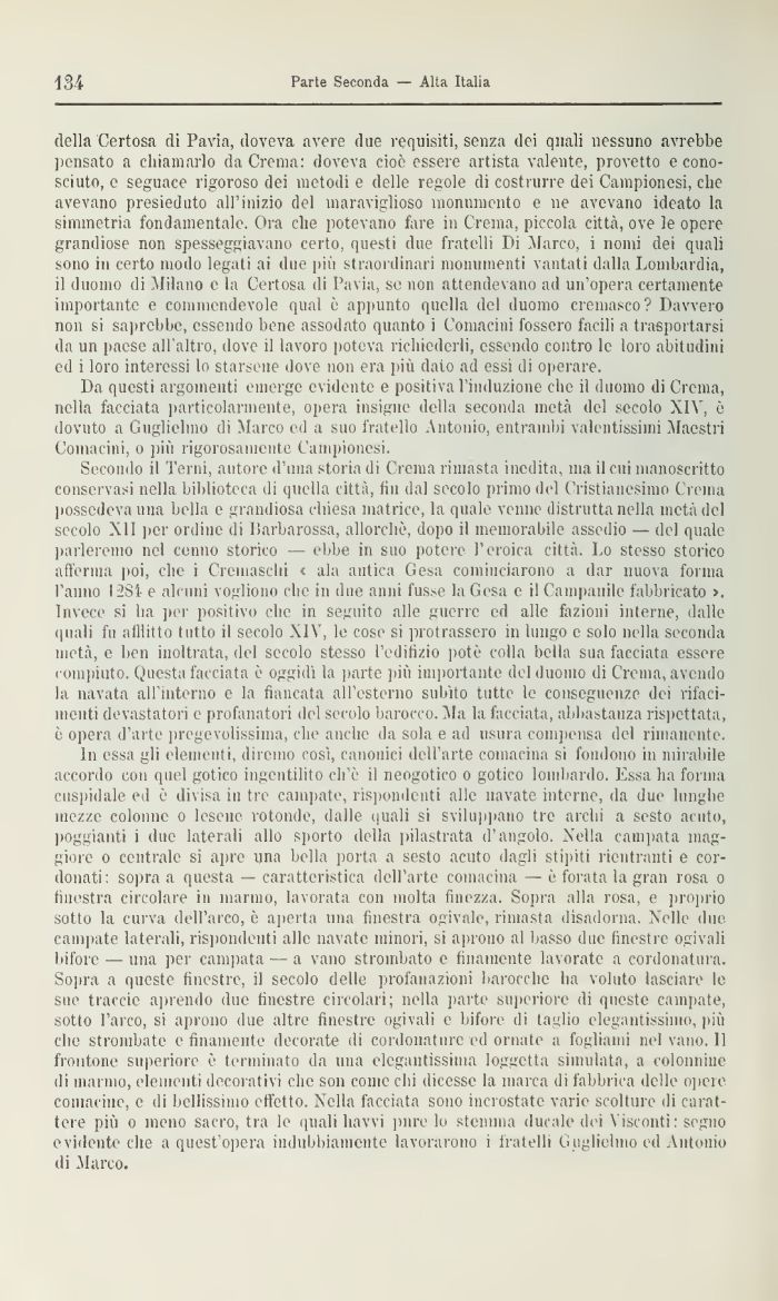 della Certosa di Pavia, doveva avere due requisiti, senza dei quali nessuno avrebbe pensato a chiamarlo da Crema: doveva cioè essere artista valente, provetto e conosciuto, e seguace rigoroso dei metodi e delle regole di costrurre dei Campioncsi, che avevano presieduto all'inizio del maraviglioso monumento e ne avevano ideato la simmetria fondamentale. Ora che potevano fare in Crema, piccola città, ove le opere grandiose non spesseggiavano certo, questi due fratelli Di Marco, i nomi dei quali sono in certo modo legati ai due piti straordinari monumenti vantati dalla Lombardia, il duomo di Milano e la Certosa di Pavia, se non attendevano ad un'opera certamente importante e commendevole qua! è appunto quella del duomo cremasco? Davvero non si saprebbe, essendo bene assodato quanto i Co macini fossero facili a trasportarsi da un paese all'altro, dove il lavoro poteva richiederli, essendo contro le loro abitudini ed i loro interessi lo starsene dove non era più dato ad essi di operare.