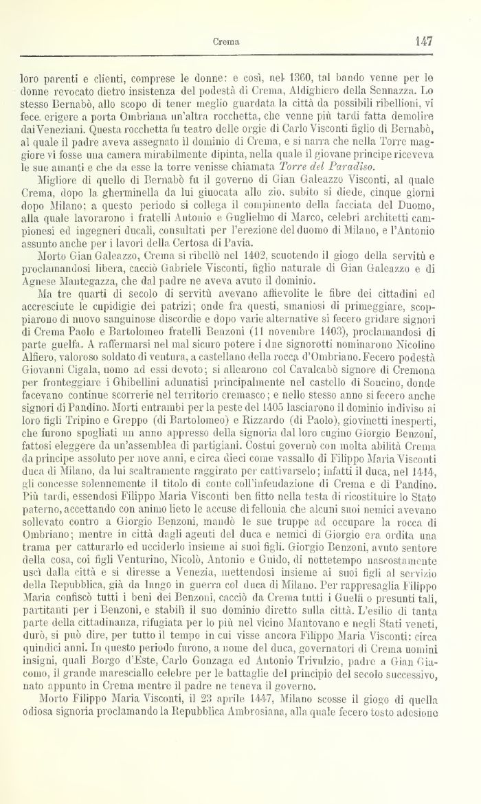 loro parenti e clienti, comprese le donne: e cosi, nel 13G0, tal bando venne per lo donne revocato dietro insistenza del podestà di Crema, Aldighiero della Sennazza. Lo stesso Bernabò, allo scopo di tener meglio guardata la città da possibili ribellioni, vi fece, erigere a porta Ombriana un'altra racchetta, clie venne più tardi fatta demolire dai Veneziani. Questa racchetta fu teatro delle orgie di Carlo Visconti tiglio di Bernabò, al quale il padre aveva assegnato il dominio di Crema, e si narra che nella Torre maggiore vi fosse una camera mirabilmente dipinta, nella quale il giovane principe riceveva le sue amanti e che da esse la torre venisse chiamata Torre del Paradiso.