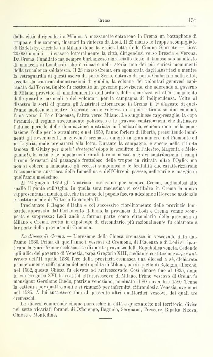 dalla città dirigendosi a Milano, A mezzanotte entrarono in Crema un battaglione di truppa e due cannoni, chiamati in rinforzo da Lodi. 11 25 marzo le truppe scompigliate di Radetzky, cacciate da Milano dopo la eroica lotta delle Cinque Giornate — circa 20,000 uomini — invasero letteralmente la città, dirigendosi verso Brescia e Verona. Da Crema, l'umiliato ma sempre burbanzoso maresciallo dettò il famoso suo manifesto di minaccia ai Lombardi, che è rimasto nella stona uno dei più curiosi monumenti della truculenta soldatesca. Il 25 marzo Crema era sgombrata dagli Austriaci e mentre la retroguardia di questi usciva da porta Serio, entrava da porta Ombriana nella città, accolta da fraterne dimostrazioni di giubilo, la colonna dei volontari genovesi capitanata dal Torres. Subito fu costituito un governo provvisorio, che aderendo al governo di Milano, provvide al mantenimento dell'ordine, della sicurezza ed all'arruolamento delle guardie nazionali e dei volontari per la campagna di indipendenza. Volte al disastro le sorti di questa, gli Austriaci ritornarono in Crema il 1° d'agosto di quell'anno medesimo, mentre l'esercito sardo volgeva in rapida ritirata su due colonne, l'ima verso il Po e Piacenza, l'altra verso Milano. Le sanguinose rappresaglie, la cupa tirannide, il regime strettamente poliziesco e le gravose contribuzioni, che distinsero l'ultimo periodo della dominazione austriaca 111 Lombardia, cementarono nella popolazione l'odio per lo straniero ; e nel 1859, l'anno foriero di libertà, presentendo imminenti gli avvenimenti, la gioventù cremasca emigrò in gran numero nel Piemonte ed in Liguria, onde prepararsi alla lotta. Durante la campagna, e specie nella ritirata famosa di Giulay per motivi strategici (dopo le sconfitte di Palestra, Magenta e Melograno !), la città e le popolazioni rurali furono messe a gravi contribuzioni, i campi furono devastati dal passaggio frettoloso delle truppe in ritirata oltre l'Oglio; ma non si ebbero a lamentare gli eccessi sanguinosi e le brutalità che caratterizzarono l'occupazione austriaca della Loinellma e dell'Oltrepò pavese, nell'aprile e maggio di quell'anno medesimo.