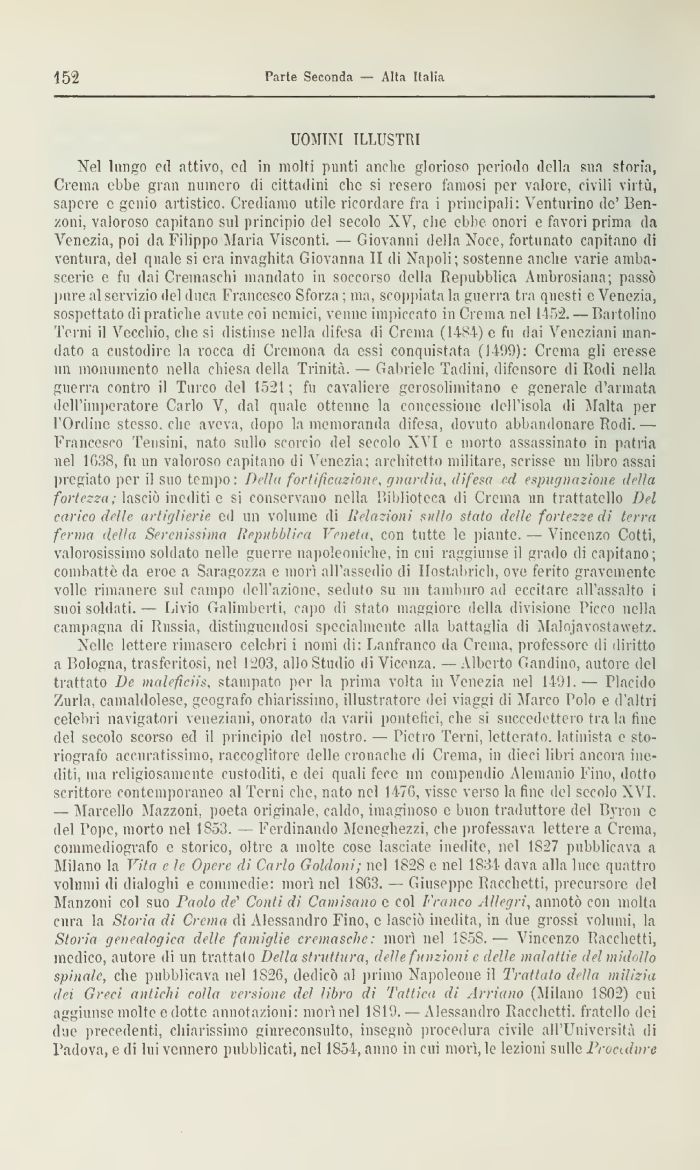 Nelle lettere rimasero celebri ì nomi di: Lanfranco da Crema, professore di diritto a Rologna, trasferitosi, nel 1203, allo Studio di Vicenza. — Alberto Gandino, autore del trattato De malefìciis, stampato per la prima volta in Venezia nel 1491 — Placido Zurla, camaldolese, geografo chiarissimo, illustratore dei viaggi di Marco Colo e d'altri celebri navigatori veneziani, onorato da varii pontefici, che si succedettero tra la fine del secolo scorso ed il principio del nostro. — Pietro Terni, letterato. latinista e storiografo accuratissimo, raccoglitore delle cronache di Crema, in dieci libri ancora inediti, ma religiosamente custoditi, e dei quali fece un compendio Aleniamo Fino, dotto scrittore contemporaneo al Terni che, nato nel 1470, visse verso la fine del secolo XVI. -- Marcello Mazzoni, poeta originale, caldo, iniaginoso e buon traduttore del Bvron e del Pope, morto nel 1S53. — Ferdinando Meneghezzi, che professava lettere a Crema, commediografo e storico, oltre a molte cose lasciate inedite, nel 1S27 pubblicava a Milano la Vita e le Opere di Carlo Goldoni; nel 1S2S e nel 1834 dava alla luce quattro volumi di dialoghi e commedie: morì nel LSG3. — Giuseppe Bacchetti, precursore del Manzoni col suo Paolo de' Conti di Camisano e col Fi anco Allegri, annotò con molta cura la Storia di Crema di Alessandro Fino, e lasciò inedita, in due grossi volumi, la Storia genealogica delle famiglie cremasehe: morì nel 1S5S.— Vincenzo Pacchetti, medico, autore di un trattalo Della struttura, delle, funzioni e delle malattie del midollo spinale, che pubblicava nel 1826, dedicò al primo Napoleone il Trattato della milizia dei Greci antichi colla versione del libro di Tattica di Affiano (Milano 1802) cui aggiunse molte e ciotte annotazioni: morì nel 1819. — Alessandro Pacchetti, fratello dei due precedenti, chiarissimo giureconsulto, insegnò procedura civile all'Università di Padova, e di lui vennero pubblicati, nel 1854, anno ili cui morì, le lezioni sulle Proculure