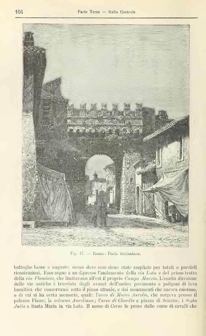 botteghe basse e anguste, meno dove esse sieno state ampliate per totali o parziali ricostruzioni. Esso segue a un dipresso l'andamento della ria iauu e del primo tratto della via Flaminia, che limitavano all'est il proprio Campo Marzio. L'esatta direzione delle vie antiche è tracciata dagli avanzi dell'antico pavimento a poligoni di lava basaltica che conservatisi sotto il piano attuale, e dai monumenti che ancora esistono, o di cui si ha certa memoria, quali: Varco di Marco Aurelio, che sorgeva presso il palazzo Fiano; la colonna Anreliana; Varco di Claudio a piazza di Sciatta; i Sepia Julia a Santa Maria in via Lata. 11 nome di Corso lo prese dalle corse di cavalli che