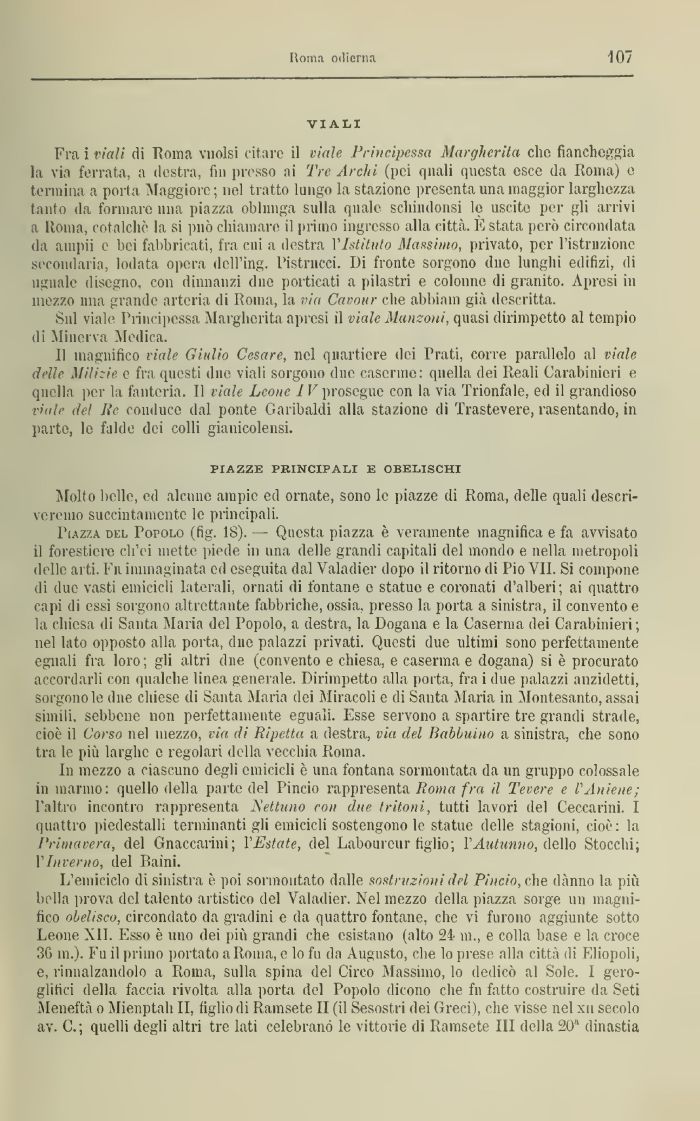 Piazza del PoroLo (fig. 18). — Questa piazza è veramente magnifica e fa avvisato il forestiero c-li'ei mette piede ili una delle grandi capitali del inondo e nella metropoli delle arti. Fu immaginata ed eseguita dal Valadier dopo il ritorno di Pio VII. Si compone di due vasti emicicli laterali, ornati di fontane e statuo e coronati d'alberi; ai quattro capi di essi sorgono altrettante fabbriche, ossia, presso la porta a sinistra, il convento e la chiesa di Santa Maria del Popolo, a destra, la Dogana e la Caserma dei Carabinieri; nel lato opposto alla porta, due palazzi privati. Questi due ultimi sono perfettamente eguali fra loro ; gli altri due (convento e chiesa, e caserma e dogana) si è procurato accordarli con qualche linea generale. Dirimpetto alla porta, fra i due palazzi anzidetti, sorgono le due chiese di Santa Maria dei Miracoli e di Santa Maria in Montesanto, assai simili, sebbene non perfettamente eguali. Esse servono a spartire tre grandi strade, cioè il Corso nel mezzo, via di Pipetta a destra, via del Babbuino a sinistra, che sono tra le più larghe e regolari della vecchia Roma.