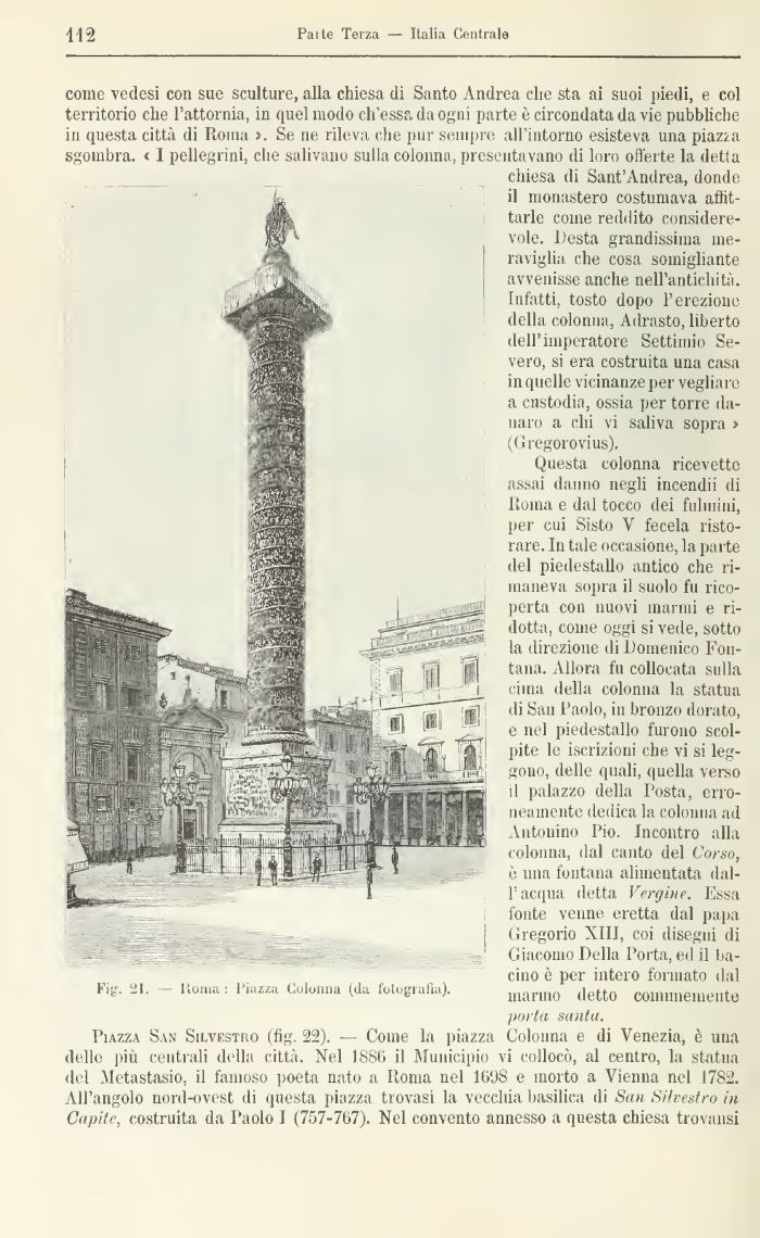 Piazza San Silvestro (fig. 22). — Come la piazza Colonna e di Venezia, è una delle più centrali della città. Nel 1886 il Municipio vi collocò, al centro, la statua del Metastasio, il famoso poeta nato a Roma nel 169S e morto a Vienna nel 1782. All'angolo nord-ovest di questa piazza trovasi la vecchia basilica di San Silvestro in Capite, costruita da Paolo I (757-767). Nel convento annesso a questa chiesa trovatisi