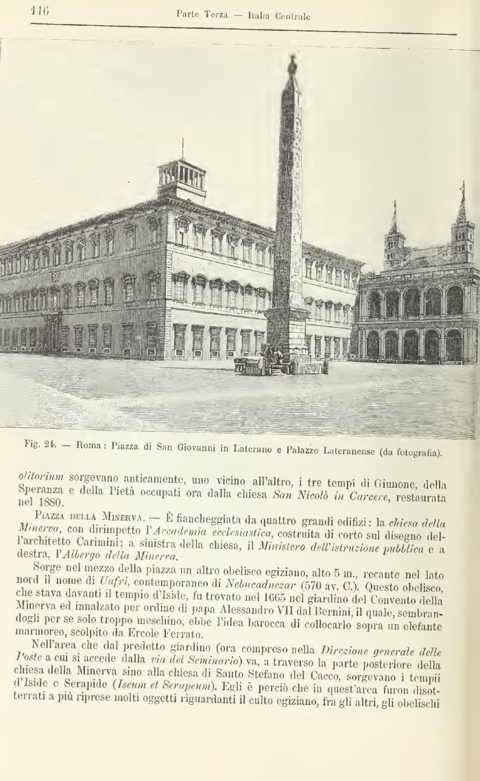 Piazza della Minerva. — è fiancheggiata da quattro grandi edilizi: la chiesa della Minerva, con dirimpetto VAccademia ecclesiastica, costruita di corto sul disegno dell'architetto Carimini; a sinistra della chiesa, il Ministero dell'istruzione pubblica e a destra, l'Albergo della Minerra.