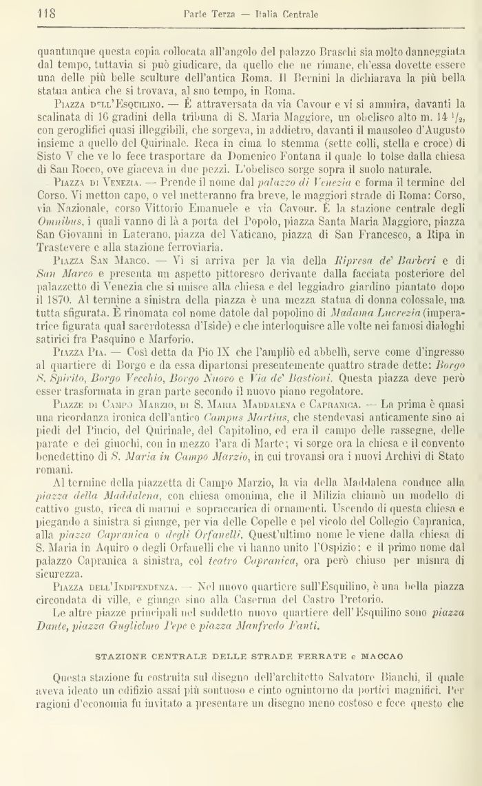Piazza cll'Esquilino. — È attraversata da via Cavour e vi si ammira, davanti la scalinata di 1G gradini della tribuna di S. Maria Maggiore, un obelisco alto ni. 14 con geroglifici quasi illeggibili, che sorgeva, in addietro, davanti il mausoleo d'Augusto insieme a quello del Quirinale. Reca in cima lo stemma (sette colli, stella e croce) di Sisto Y che ve lo fece trasportare da Domenico Fontana il quale, lo tolse dalla chiesa di San Rocco, ove giaceva in due pezzi. L'obelisco sorge sopra il suolo naturale.