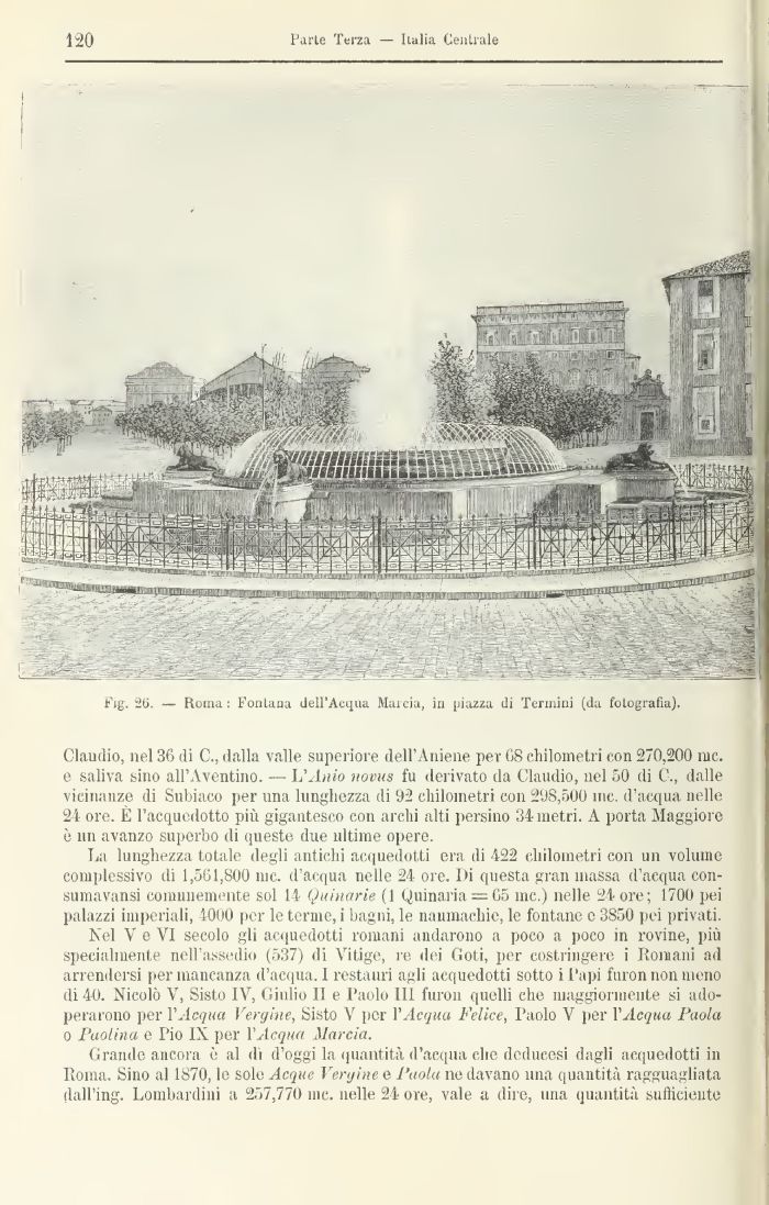 Grande ancora è al di d'oggi la quantità d'acqua che deilucesi dagli acquedotti in Roma. Sino al 1870, le sole Acque Vergine e Paola ne davano una quantità ragguagliata dall'ing. Lombardini a 257,770 ine. nelle 24 ore, vale a dire, una quantità sufficiente