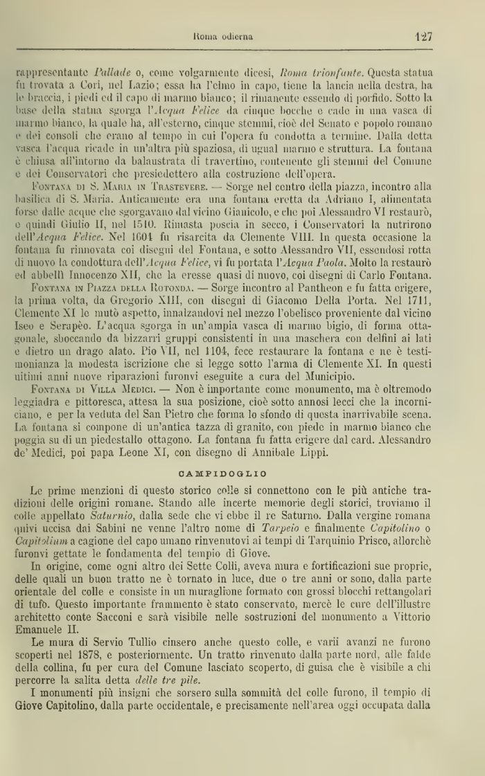 rappresentante Pallade o, corno volgarmente dicesi, Roma trionfante. Questa statua fu trovata a Cori, nel Lazio; essa ha l'elmo in capo, tiene la lancia nella destra, ha le braccia, i piedi ed il capo di marino bianco; il rimanente essendo di porfido. Sotto la base della statua sgorga ILIa/un Felice da cinque bocche o cado in una vasca di marino bianco, la quale ha, all'esterno, cinque stonimi, cioè del Senato e popolo romano e dei consoli che erano al tempo in cui l'opera fu condotta a termine. Dalla detta vasca l'acqua ricade in un'altra più spaziosa, di ugual marmo e struttura. La fontana è chiusa all'intorno da balaustrata di travertino, contenente gli stemmi del Connine e dei Conservatori clic presiedettero alla costruzione dell'opera.