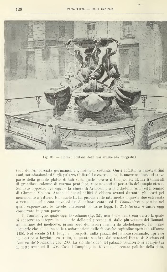 sede dell'Ambasciata germanica e giardini circostanti. Quivi infatti, in questi ultimi anni, sottofondandosi il già palazzo Caflarelli e costruendosi le nuove scuderie, si trovò parte della grande platea di tufi sulla quale posava il tempio, ed alcuni frammenti di grandiose colonne di marmo pentelico, appartenenti al peristilio del tempio stesso. Sul lato opposto, ove oggi è la chiesa di Araroeli, era la cittadella {arx) ed il tempio di (sitinone Moneta. Anche di questi edilizi si ebbero avanzi durante gli scavi pel monumento a Vittorio Emanuele II. La piccola valle intermedia a queste due estremità o sette del colle conteneva edilizi di minore conto, ed il TubitUirìum o portico nel quale esponevansi le tavole contenenti le varie leggi. Il Tubidarium è ancor oggi conservato in gran parte.