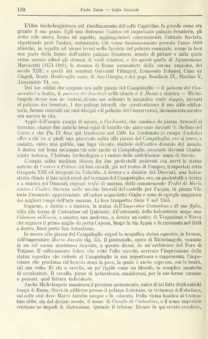 In mezzo alla piazza del Campidoglio ergesi la magnifica statua equestre, in bronzo, dell'imperatore Marco Aurelio (fig. 33). Il piedestallo, opera di Michelangelo, consiste in un sol masso marmoreo ricavato, a quanto dicesi, da un'architrave del Poro ili Trajano. Il collocamento felice, che evitò l'alto zoccolo, accresce l'impressione della statua equestre che ridiede al Campidoglio la sua importanza e rappresenta l'imperatore che proclama col braccio steso la pace, la quale è anche espressa, con la bontà, sul suo volto. Ei sta a cavallo, un po' rigido come un filosofo, in semplice mantello di cavalcatore. Il cavallo, pieno di naturalezza, manifestasi, per le sue forme carnose e pesanti, qual fattura individuale.