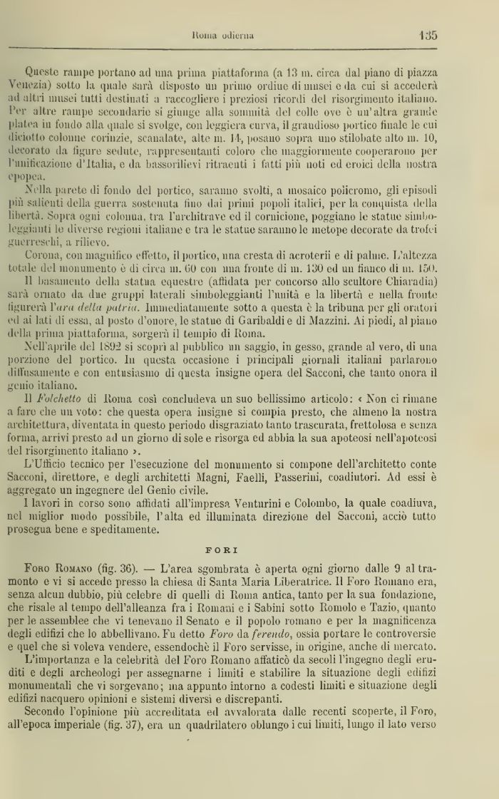Fono Romano (fig. 36). — L'area sgombrata è aperta ogni giorno dalle 9 al tramonto e vi si accede presso la chiesa di Santa Maria Liberatrice. 11 Foro Romano era, senza alcun dubbio, più celebre di quelli di Roma antica, tanto per la sua fondazione, che risale al tempo dell'alleanza fra i Romani e i Sabini sotto Romolo e Tazio, quanto per le assemblee che vi tenevauo il Senato e il popolo romano e per la magnificenza degli edilìzi che lo abbellivano. Fu detto Foro da ferendo, ossia portare le controversie e quel che si voleva vendere, essendoché il Foro servisse, in origine, anche di mercato.