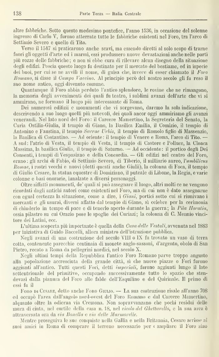 altre fabbriche. Sotto questo medesimo pontefice, l'anno 1530, in occasione del solenne ingresso di Carlo V, furono atterrate tutte le fabbriche esistenti nel Foro, tra l'arco di Settimio Severo e quello di Tito.