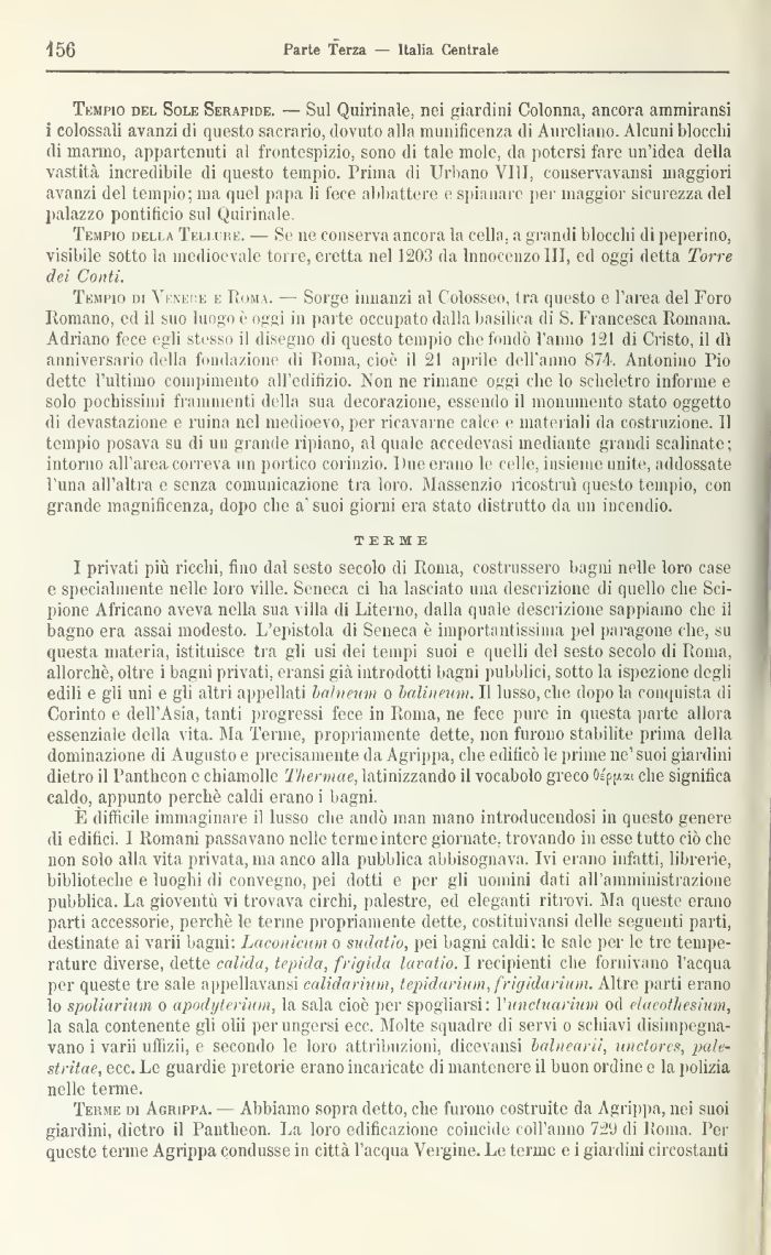 Terme dì Agrippa. — Abbiamo sopra detto, che furono costruite da Agrippa, nei suoi giardini, dietro il Pantheon. La loro edificazione coincide coiranno 72lJ di Roma. Per queste terme Agrippa condusse in città l'acqua Vergine. Le terme e i giardini circostanti