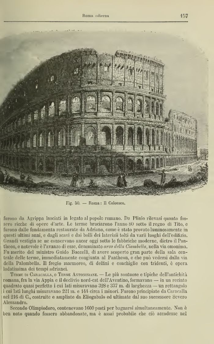 Terme di Caracalla, o Terme Antoniniane. —Le più sontuose e tipiche dell'antichità romana, fra la via Appia e il declivio nord-est dell'Aventino, formavano — in un recinto quadrato quasi perfetto i cui lati misuravano 328 e 337 ni. di larghezza — un rettangolo cui lati lunghi misuravano 221 m. e 144 circa i minori. Furono principiato da Caracalla ìel 216 di C., costruite e ampliate da Eliogabalo ed ultimate dal suo successore Severo Alessandro.