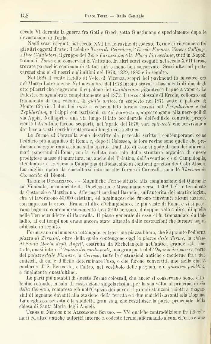 Negli scavi eseguiti nel secolo XY1 fra le rovine di codeste Terme si rinvennero fra gli altri oggetti d'arte: il celebre Torso di Belvedere, YErcole Farnese, Venere Callipige, 1 Due Gladiatori, il gruppo del Toro Furnesiano e la Flora Farnesiana, tutti in Napoli, tranne il Torso che conservasi in Vaticano. In altri scavi eseguiti nel secolo XVII furono trovate parecchie centinaia di statue più o meno ben conservate. Scavi ulteriori prati? carotisi sino ai dì nostri e gii ultimi nel 1873, 1879, 1880 e in seguito.