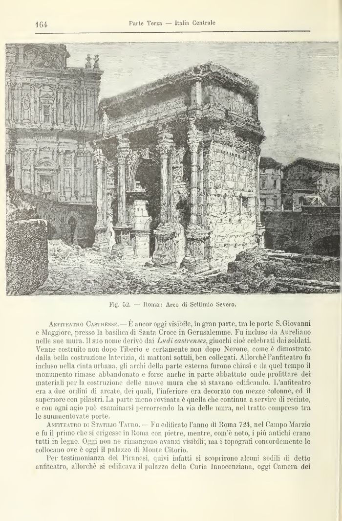 Anfiteatro Castrense.— È ancor oggi visibile, in gran parte, tra le porte S. Giovanni e Maggiore, presso la basilica di Santa Croce in Gerusalemme. Fu incluso da Aureliano nelle sue mura. Il suo nome derivò dai Ludi castrenses, giuochi cioè celebrati dai soldati. Venne costruito non dopo Tiberio e certamente non dopo Nerone, come è dimostrato dalla bella costruzione laterizia, di mattoni sottili, ben collegati. Allorché l'anfiteatro fu incluso nella cinta urbana, gli archi della parte esterna furono chiusi e da quel tempo il monumento rimase abbandonato e forse anche in parte abbattuto onde profittare dei materiali per la costruzione delle nuove mura che si stavano edificando. L'anfiteatro era a due ordini di arcate, dei quali, l'inferiore era decorato con mezze colonne, ed il superiore con pilastri. La parte meno rovinata è quella che continua a servire di recinto, e con ogni agio può esaminarsi percorrendo la via delle mura, nel tratto compreso tra le summentovate porte.