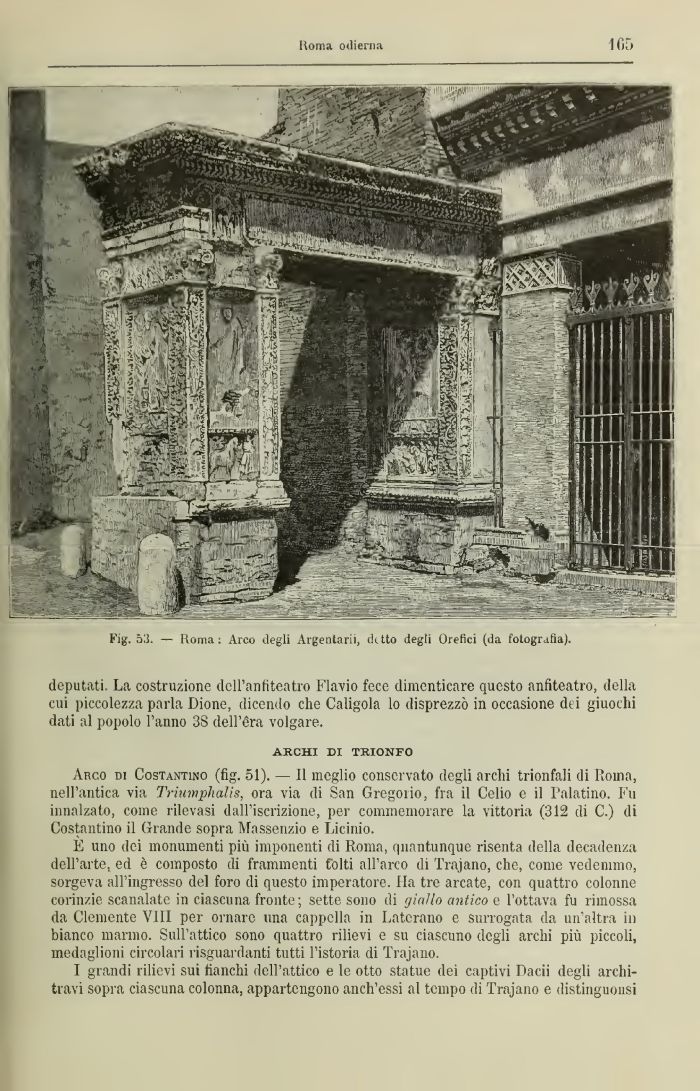 Arco di Costantino (fig. 51). — Il meglio conservato degli archi trionfali di Roma, neH'antica via Triumphalis, ora via di San Gregorio, fra il Celio e il Palatino. Fu innalzato, come rilevasi dall'iscrizione, per commemorare la vittoria (312 di C.) di Costantino il Grande sopra Massenzio e Licinio.