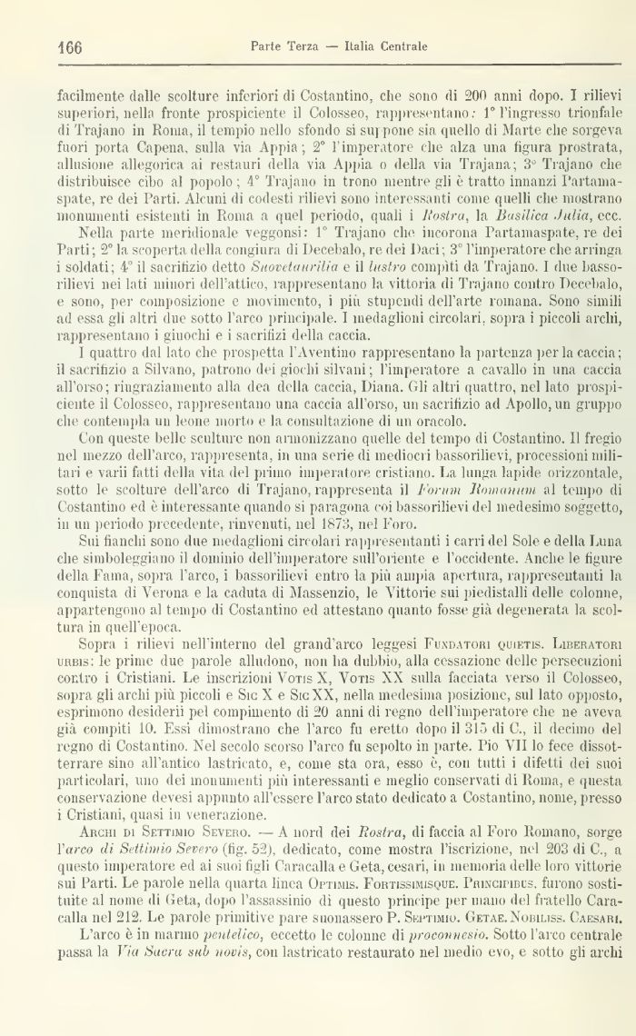 Archi di Settimio Severo. — A nord dei lìostra, di faccia al Foro Romano, sorge Varco di Settimio Severo (fig. 52), dedicato, come mostra l'iscrizione, nel 203 di C., a questo imperatore ed ai suoi figli Caracalla e Geta, cesari, ir memoria delle loro vittorie sui Parti. Le parole nella quarta linea Optimi?. Fortissimisque. Princu'ibus. furono sostituite al nome di Geta, dopo 1 assassinio di questo principe per mano del fratello Cara-calla nel 212. Le parole primitive pare suonassero P. Skptimio. Getae.Nobiijss. Caesari.