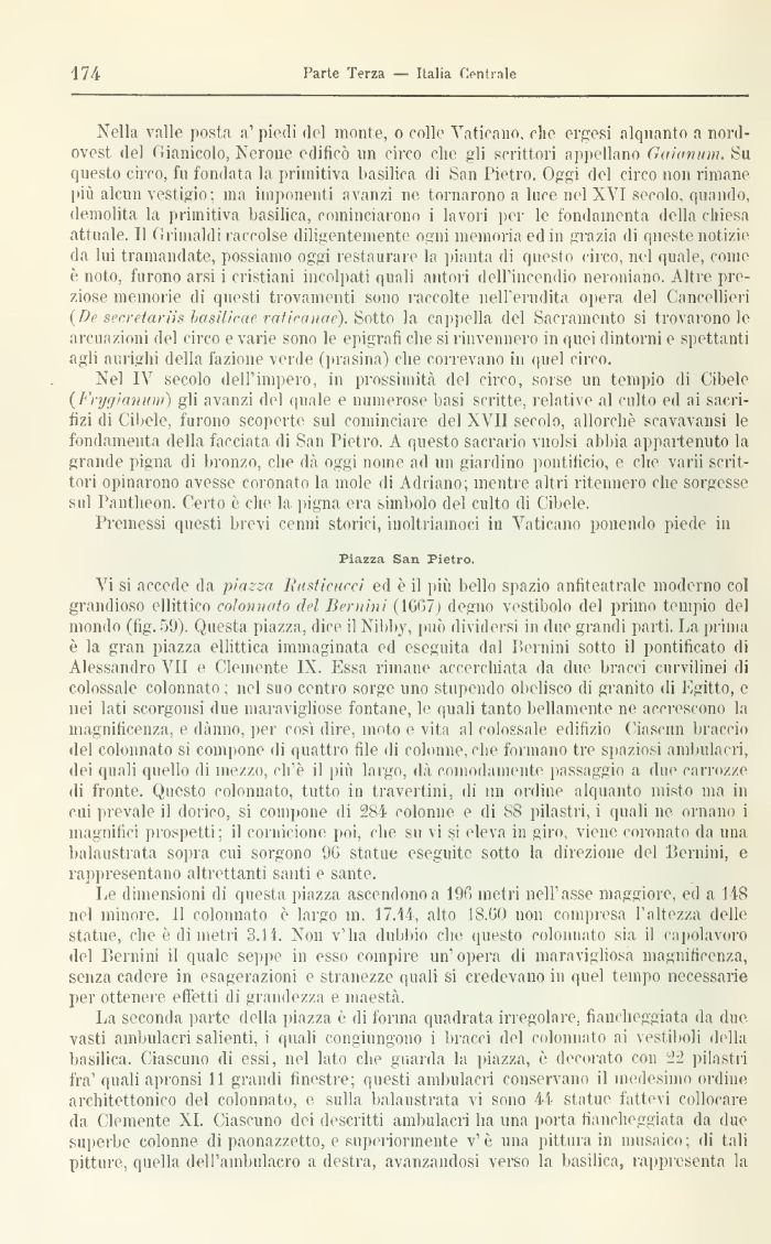 Vi si accede ila piazza Iìmtìcucet ed è il più bello spazio anfiteatrale moderno col grandioso ellittico colonnato del Bernini (1GG7) degno vestibolo del primo tempio del mondo (fig. 59). Questa piazza, dice il Nibby, può di\idorsi in due grandi parti. La prima è la gran piazza ellittica immaginata ed eseguita dal Bernini sotto il pontificato di Alessandro VII e Clemente IX. Essa rimane accerchiata da due bracci curvilinei di colossale colonnato : nel suo centro sorge uno stupendo obelisco di granito di Egitto, e liei lati scorgonsi due maraviglio® fontane, le quali tanto bellamente ne accrescono la magnificenza, e dànno, per così dire, moto e vita al colossale edifizio ( iascnn braccio del colonnato si compone di quattro file di colonne, che formano tre spaziosi ambulacri, dei quali quello di mezzo, ciré il più largo, dà comodamente passaggio a due carrozze di fronte. Questo colonnato, tutto in travertini, ili mi ordine alquanto misto ma in cui prevale il dorico, si compone di 284 colonne e ili SS pilastri, i quali ne ornano i magnifici prospetti; il cornicione poi, che su vi si eleva m giro, viene coronato da una balaustrata sopra cui sorgono 9G statue eseguite sotto la direzione del Bernini, e rappresentano altrettanti santi e sante.