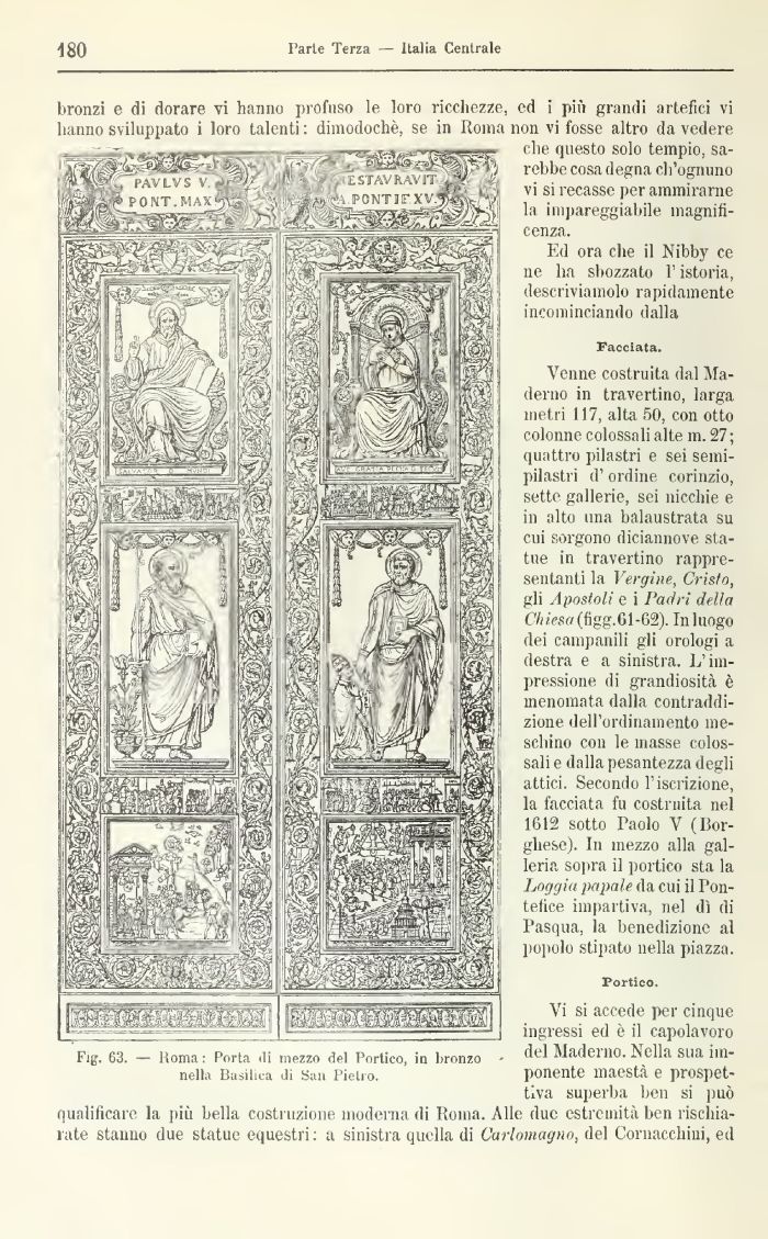 Venne costruita dal Ma-derno in travertino, larga metri 117, alta 50, con otto colonne colossali alte m. 27; quattro pilastri e sei semi-pilastri d'ordine corinzio, sette gallerie, sei nicchie e ili alto una balaustrata su cui sorgono diciannove statue in travertino rappresentasti la Vergine, Cristo, gli Apostoli e i Pad ri della Chiesa (figg.Gl-62). In luogo dei campanili gli orologi a destra e a sinistra. L'impressione di grandiosità è menomata dalla contraddizione dell'ordinamento meschino con le masse colossali e dalla pesantezza degli attici. Secando l'iscrizione, la facciata fu costruita nel 1612 sotto Paolo V (Borghese). In mezzo alla galleria sopra il portico sta la Loggia papale da cui il Pontefice impartiva, nel dì di Pasqua, la benedizione al popolo stipato nella piazza.