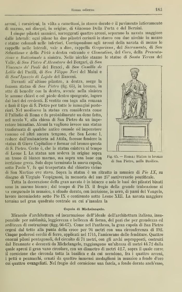Davanti all'ultimo pilastro, a destra, sorge la famosa statua di San l'ietro (fig. 65), hi bronzo, in atto di benedir con la destra, avente nella sinistra le somme chiavi e col piede destro sporgente, logoro dai baci dei credenti. E vestito con toga alla romana e fissò il tipo di S. Pietro per tutte le immagini posteriori Nel medioevo la statua era considerata come il Palladio di Roma e fu probabilmente un dono fatto, nel secolo V, alla chiesa di San Pietro da un imperatore bizantino. Alcuni la vogliono invece una statua trasformata di qualche antico console od imperatore romano ed altri ancora tengono, che San Leone 1, reduce dall'ainbascieria ad Attila, facesse fondere la statua di Giove Capitolino e formar col bronzo questa di S. Pietro. Certo è, che la statua esisteva al tempo di Leone I. La statua non sedeva in origine sopra ini trono di bianco marmo, ma sopra una base con iscrizione greca. Solo dopo terminata la nuova cupola, sotto Paolo V, fu qui trasportata dal chiostro vicino di San Martino ove stava. Sopra la statua è un ritratto in musaico di Pio IX, su disegno di Virginio Vespignani, ni memoria del suo 25° anniversario pontificale.