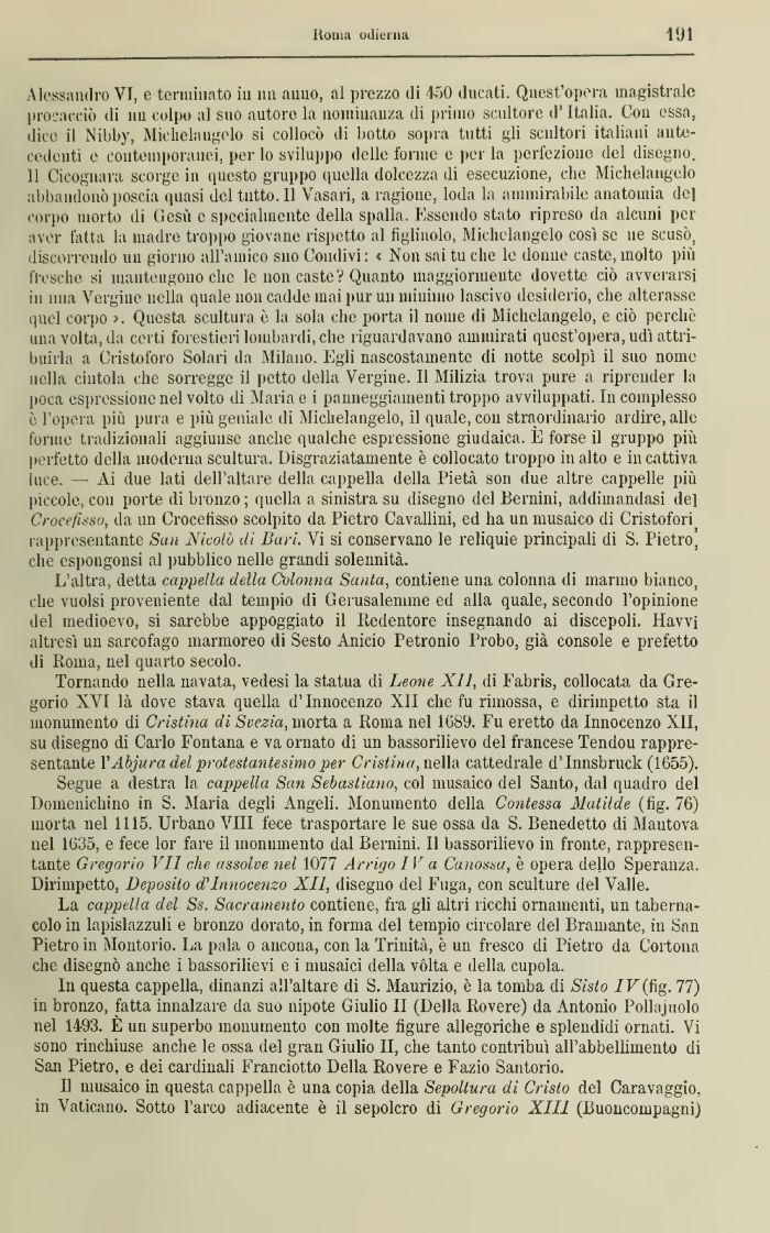 Alessandro VI, e terminato in mi anno, al prezzo di 450 ducati. Quest'opera magistrale procacciò di un colpo al suo autore la nominanza di primo scultore d'Italia. Con essa, dice il Nibby, Michelangelo si collocò di botto sopra, tutti gli scultori italiani antecedenti e contemporanei, per lo sviluppo delle forine e per la perfezione del disogno. 11 Cicognara scorge in questo gruppo quella dolcezza di esecuzione, che Michelangelo abbandonò poscia quasi del tutto II Vasari, a ragione, loda la ammirabile anatomia del corpo morto di Gesù e specialmente della spalla. Essendo stato ripreso da alcuni per a\er fatta la madre troppo giovane rispetto al figliuolo, Michelangelo così se ne scusò, discorrendo uu giorno all'amico suo C'ondivi. « Non sai tu che le donne caste, molto più fresche si mantengono che le non caste? Quanto maggiormente dovette ciò avverarsi in ima Vergine nella quale non cadde inai pur un minimo lascivo desiderio, che alterasse quel corpo >. Questa scultura è la sola che porta il nome di Michelangelo, e ciò perche una volta, da certi forestieri lombardi, che riguardavano ammirati quest'opera, udì attribuirla a Cristoforo Solari da Milano. Egli nascostamente di notte scolili il suo nome nella cintola che sorregge il petto della Vergine. Il Milizia trova pure a riprender la poca espressione nel volto ili Maria e i panneggiamenti troppo avviluppati. In complesso è l'opera più pura e più geniale di Michelangelo, il quale, con straordinario ardire, alle forme tradizionali aggiunse anche qualche espressione giudaica. E forse il gruppo più perfetto della inodorila scultura. Disgraziatamente è collocato troppo in alto e in cattiva luce. —- Ai due lati dell'altare della cappella della Pietà son due altre cappelle più piccole, con porte di bronzo ; quella a sinistra su disegno del Bernini, addiinandasi del Crocefisso, ila un Crocefisso scolpito da Pietro Cavallini, ed ha un musaico di Cristofori rappresentante San Nicolò di Buri. Vi si conservano le reliquie principali di S. Pietro' che espongonsi al pubblico nelle grandi solennità.