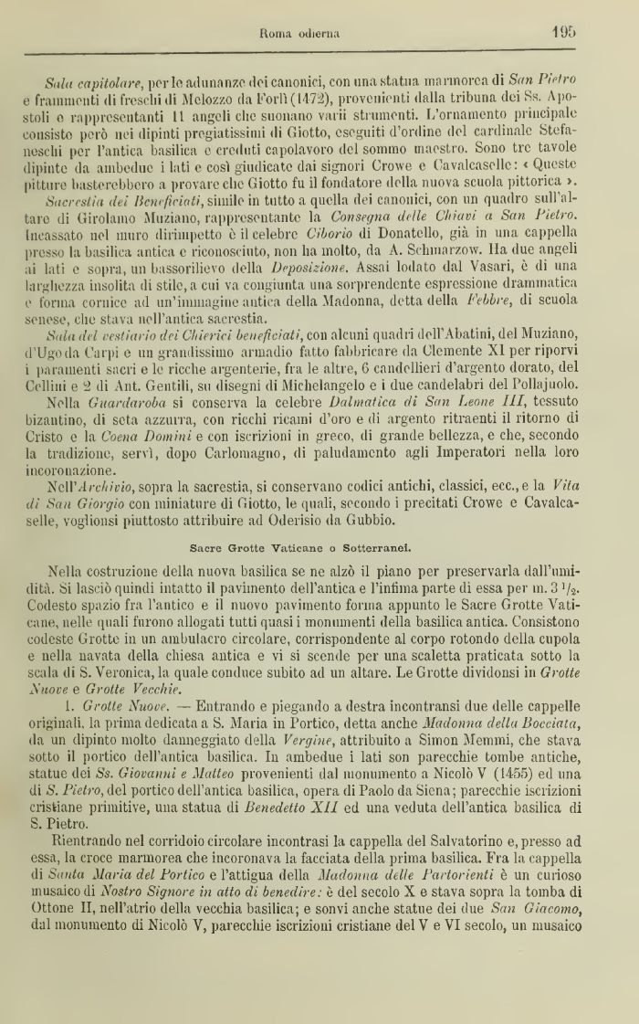 Sala capitolare, por Io adunanze dei canonici, con una statua marmorea di San Pietro e frammenti di freschi di Melozzo da Forlì (1472), provenienti dalla tribuna dei Ss. Apostoli o rappresentanti 11 angeli che suonano vai ii strumenti. L'ornamento principale consisto però nei dipinti pregiatissimi ili Giotto, eseguiti d'ordino del cardinale Stefa-nosclii per l'antica basilica e creduti capolavoro del sommo maestro. Sono tre tavole dipinte da ambedue i lati e così giudicato dai signori Crowe e Cavalcasene : < Queste pitture basterebbero a provare che Giotto fu il fondatore della nuova scuola pittorica >.