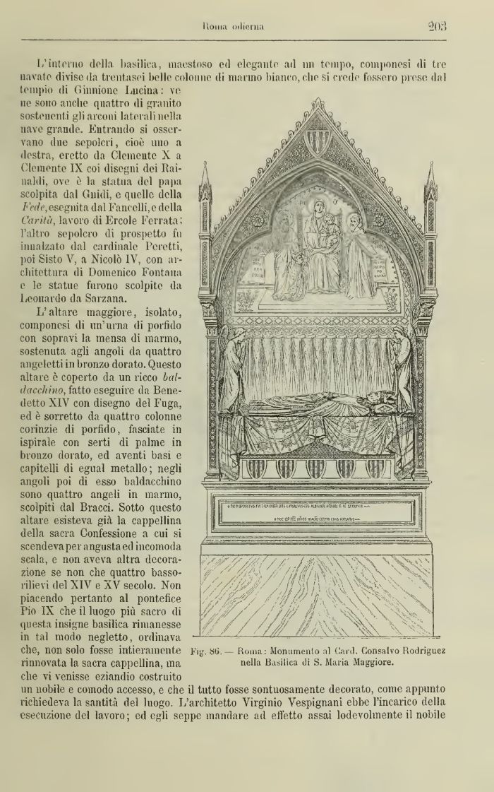 L'altare maggiore, isolato, componesi dì un'urna di porfido con sopravi la mensa di marmo, sostenuta agli angoli da quattro angeletti 111 bronzo dorato. Questo altare è coperto da un ricco baldacchino, fatto eseguire da Benedetto XIV con disegno del Fuga, ed è sorretto da quattro colonne corinzie dì porfido, fasciate in ispirale con serti di palme in bronzo dorato, ed aventi basi e capitelli di egual metallo; negli angoli poi dì esso baldacchino sono quattro angeli in marmo, scolpiti dal Bracci. Sotto questo altare esìsteva già la cappellina della sacra Confessione a cui si scendeva per angusta ed incomoda scala, e non aveva altra decorazione se non che quattro bassorilievi del XIV e XV secolo. Non piacendo pertanto al pontefice Pio IX che il luogo più sacro di questa insigne basilica rimanesse in tal modo negletto, ordinava che, non solo fosse intieramente pfg SU. Roma: Monumento al Cani. Consalvo Rodriguez rinnovata la sacra cappellina, ma ella Basilica di S. Maria Maggiore,