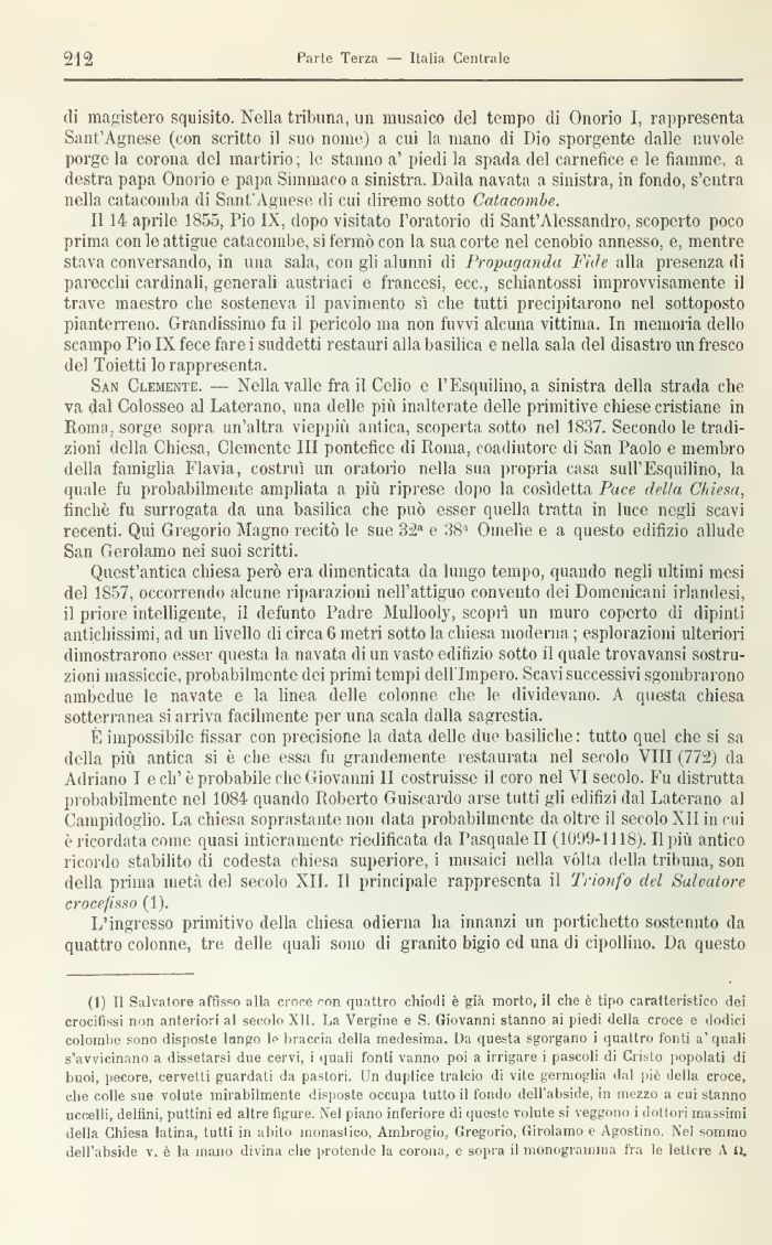 San Clemente. — Nella valle fra il Celio e l'Esquilmo, a sinistra della strada che va dal Colosseo al Laterano, una delle più inalterate delle primitive chiese cristiane in Roma, sorge sopra un'altra vieppiù antica, scoperta sotto nel 1837. Secondo le tradizioni della Chiesa, Clemente III pontefice di Roma, coadiutore di San Paolo e membro della famiglia Flavia, costruì un oratorio nella sua propria casa suH'Esquilino, la (piale fu probabilmente ampliata a più riprese dopo la tosi detta Pace delta Chiesa, tinche fu surrogata da una basilica che può esser quella tratta in luce negli scavi recenti. Qui Gregorio Magno recitò le sue 32a e 3Sa Omelìe e a questo edifizio allude San Gerolamo nei suoi scritti.